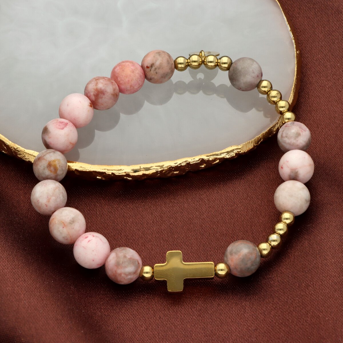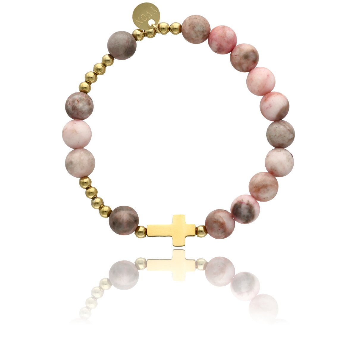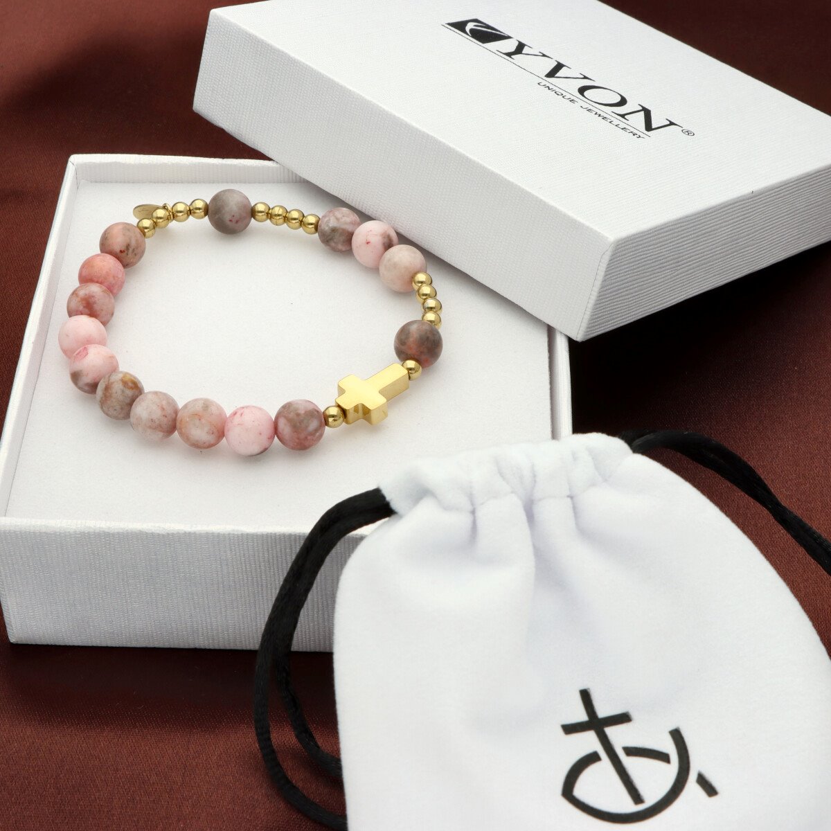 Różaniec na rękę damski, wykonany ze stali szlachetnej złoconej i kamieni naturalnych (opal pudrowy matowy). Wielkość kamieni: 8 mm Zestaw w eleganckim pudełku i z sakiewką GRATIS. Idealny pomysł na Komunię Świętą.