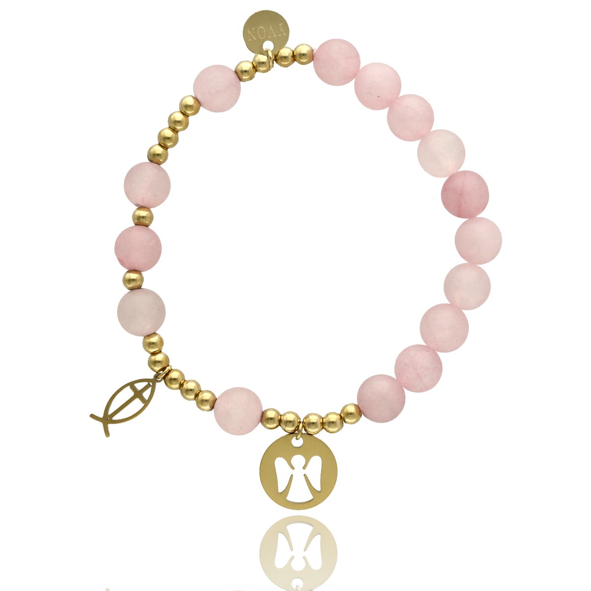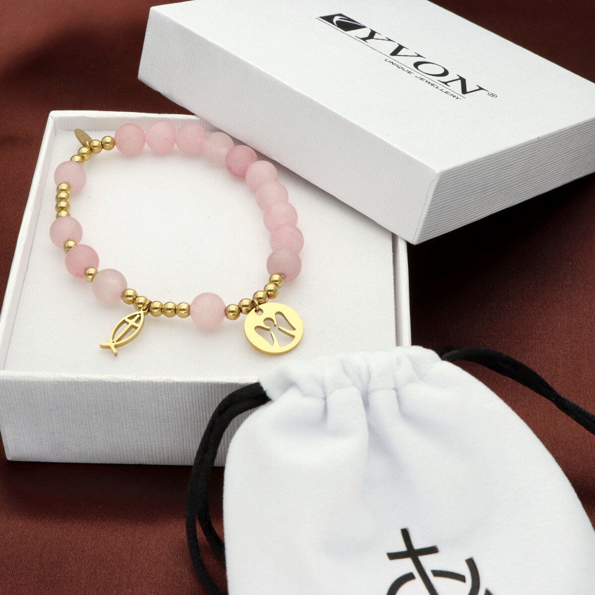 Różaniec na rękę damski, wykonany ze stali szlachetnej złoconej i kamieni naturalnych (jadeit matowy różowy). Wielkość kamieni: 8 mm Zestaw w eleganckim pudełku i z sakiewką GRATIS. Idealny pomysł na Komunię Świętą.