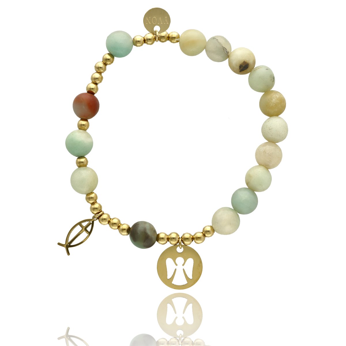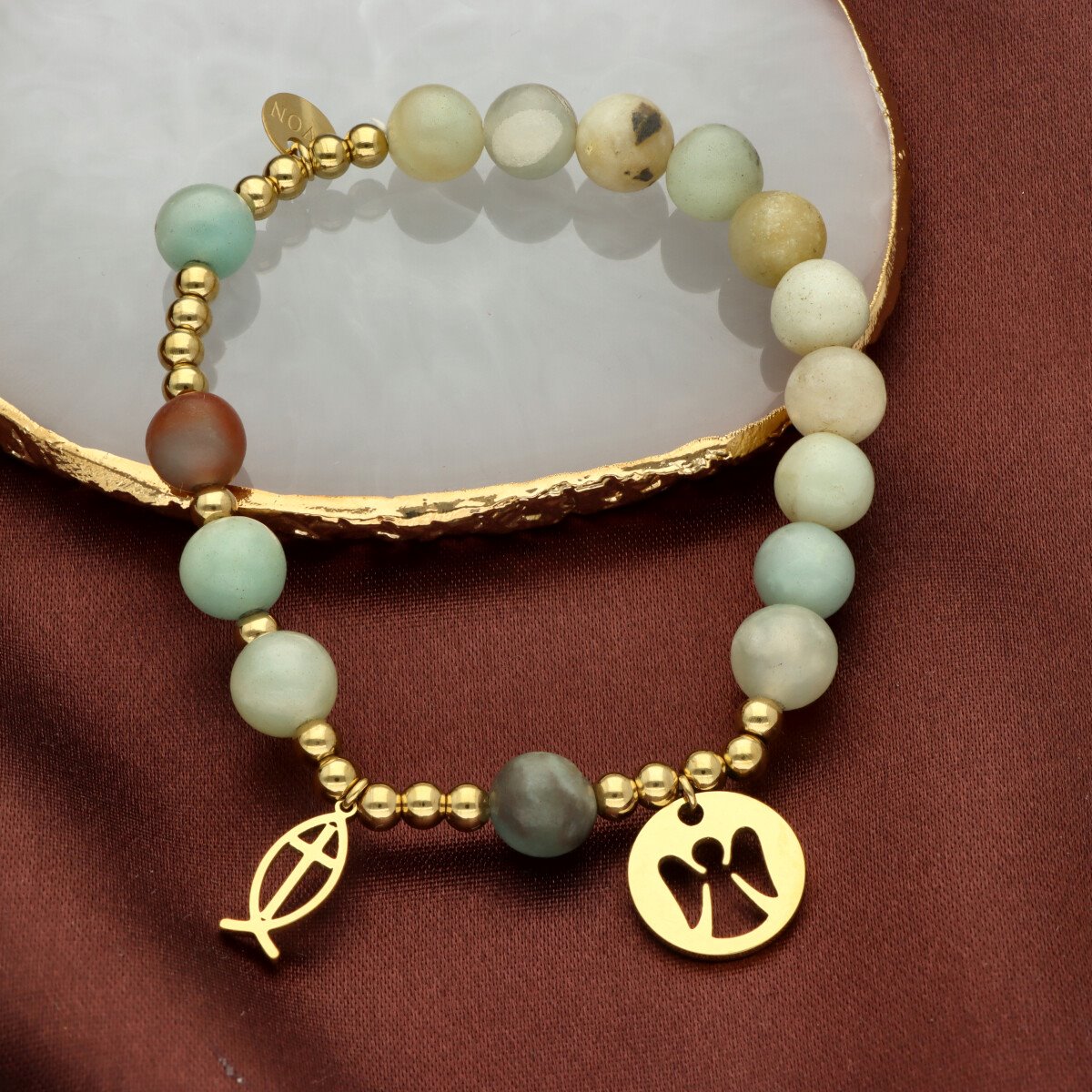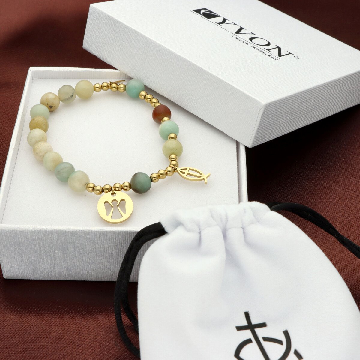Różaniec na rękę damski, wykonany ze stali szlachetnej złoconej i kamieni naturalnych (amazonit). Wielkość kamieni: 8 mm Zestaw w eleganckim pudełku i z sakiewką GRATIS. Idealny pomysł na Komunię Świętą.