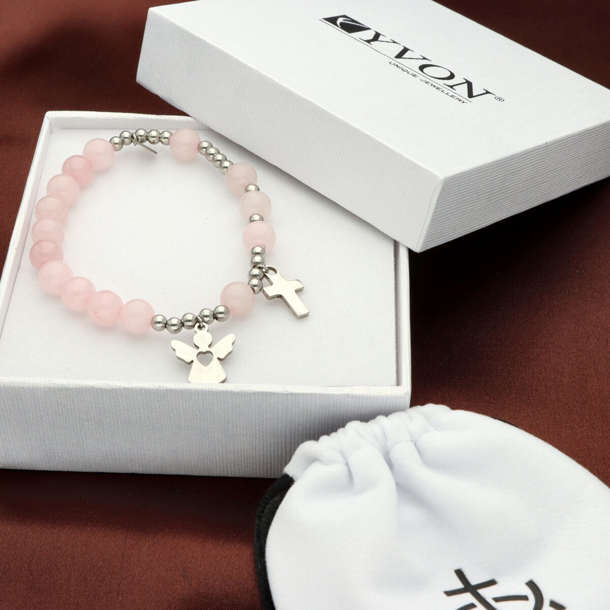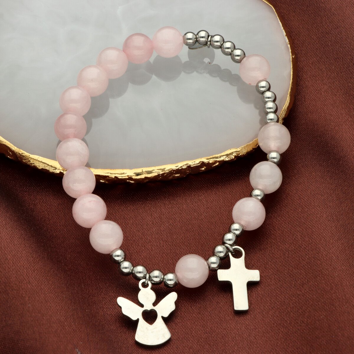 Różaniec na rękę damski, wykonany ze stali szlachetnej złoconej i kamieni naturalnych (jadeit różowy). Wielkość kamieni: 8 mm Zestaw w eleganckim pudełku i z sakiewką GRATIS. Idealny pomysł na Komunię Świętą.