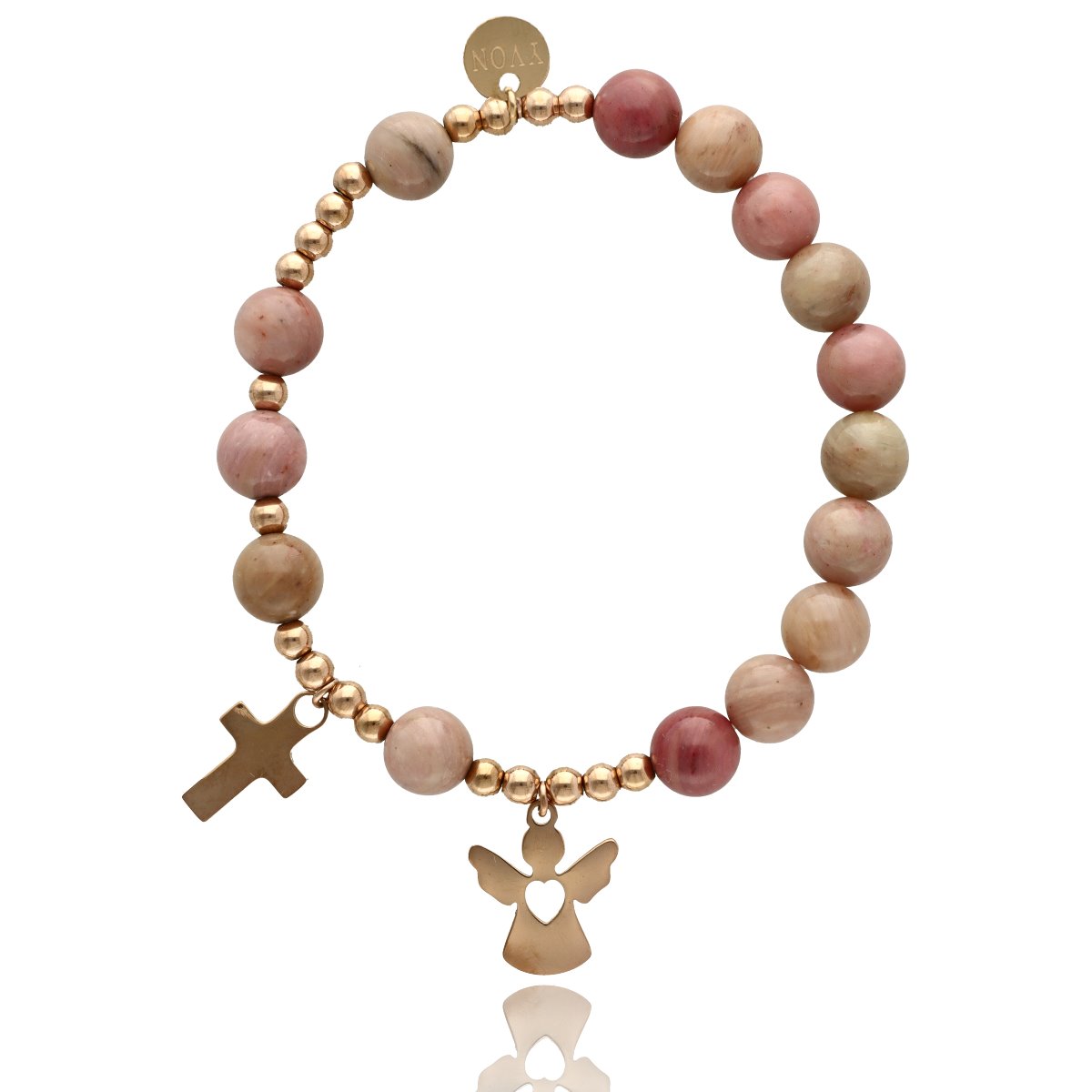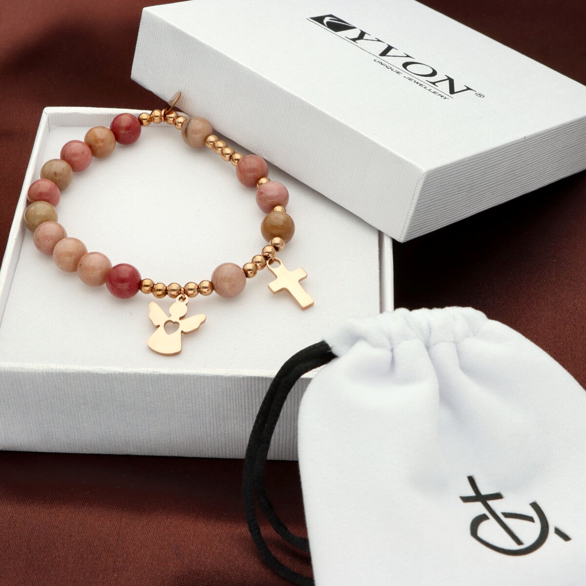Różaniec na rękę damski, wykonany ze stali szlachetnej złoconej i kamieni naturalnych (rodochrozyt). Wielkość kamieni: 8 mm Zestaw w eleganckim pudełku i z sakiewką GRATIS. Idealny pomysł na Komunię Świętą.