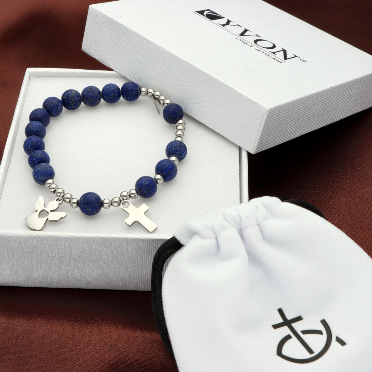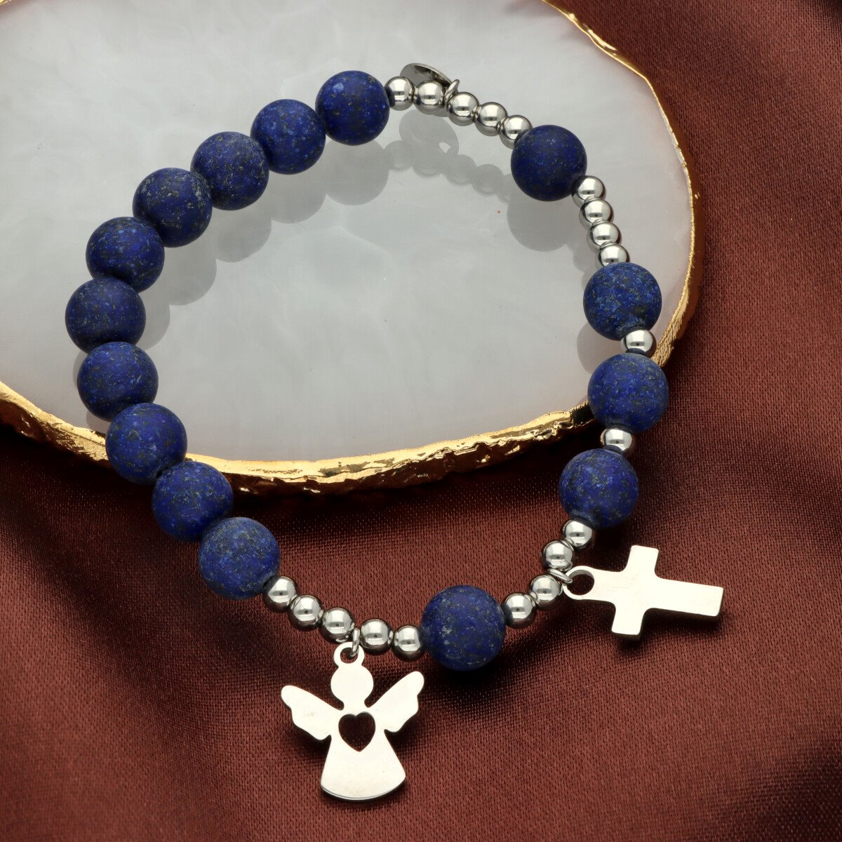 Różaniec na rękę damski, wykonany ze stali szlachetnej złoconej i kamieni naturalnych (jadeit granatowy). Wielkość kamieni: 8 mm Zestaw w eleganckim pudełku i z sakiewką GRATIS. Idealny pomysł na Komunię Świętą.