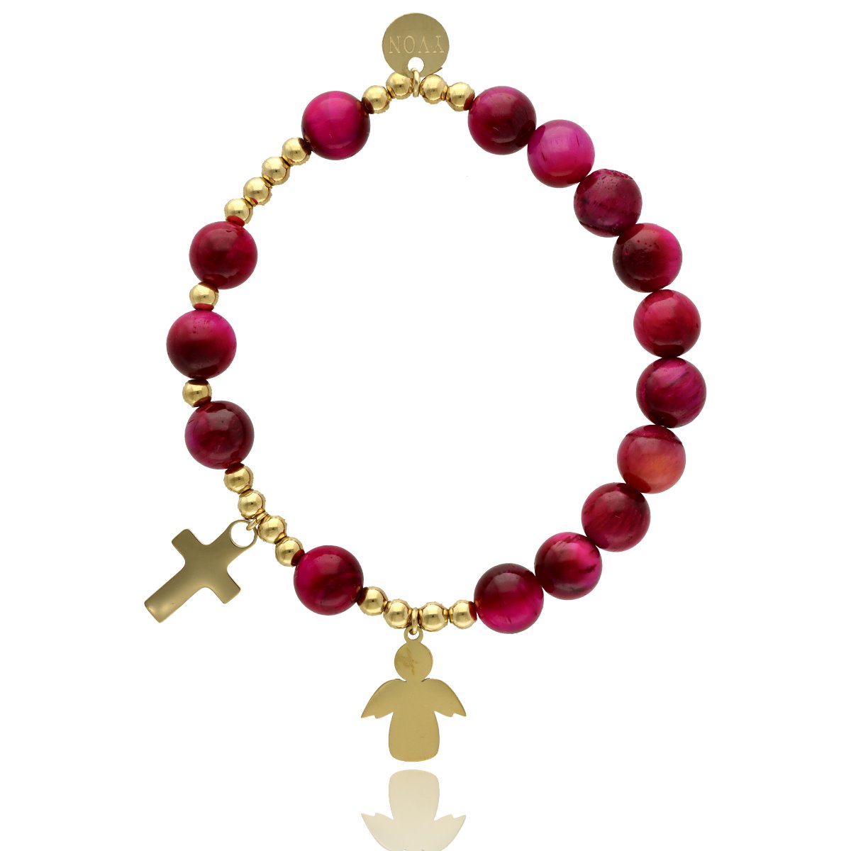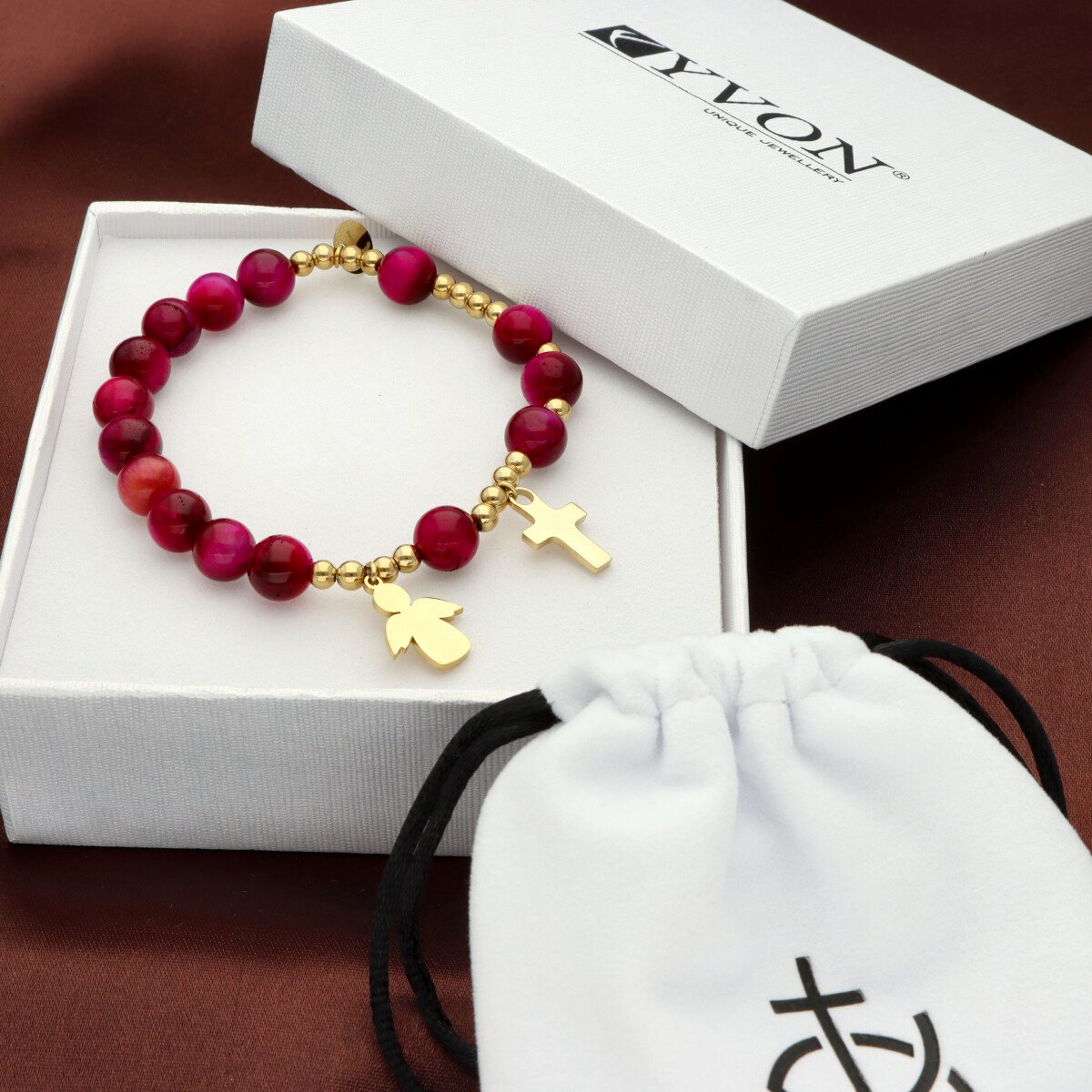 Różaniec na rękę damski, wykonany ze stali szlachetnej złoconej i kamieni naturalnych (tygrysie oko różowe). Wielkość kamieni: 8 mm Zestaw w eleganckim pudełku i z sakiewką GRATIS. Idealny pomysł na Komunię Świętą.