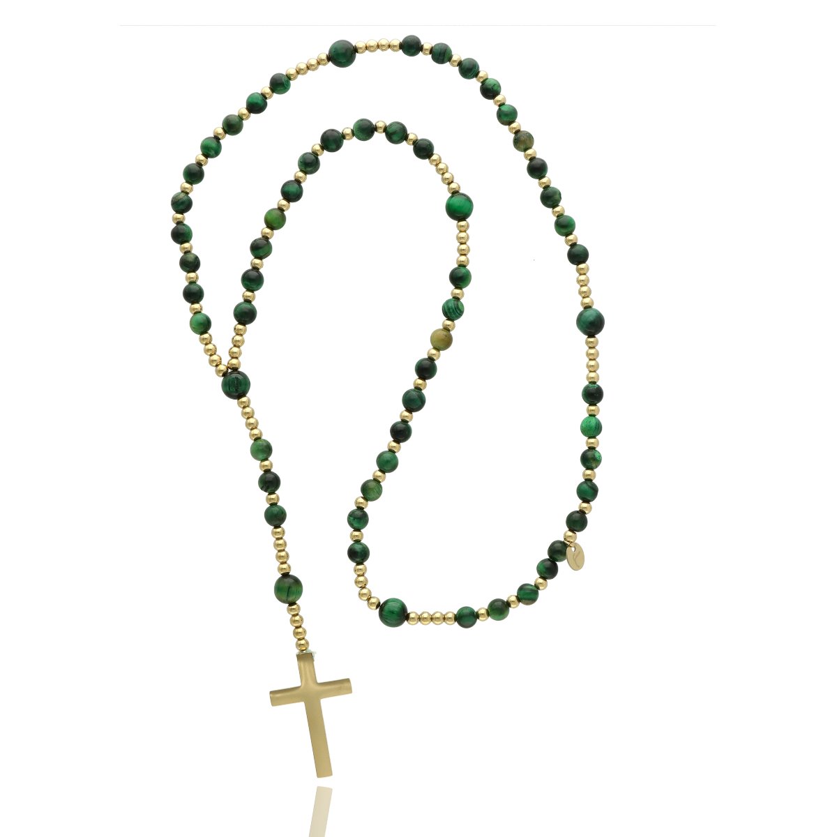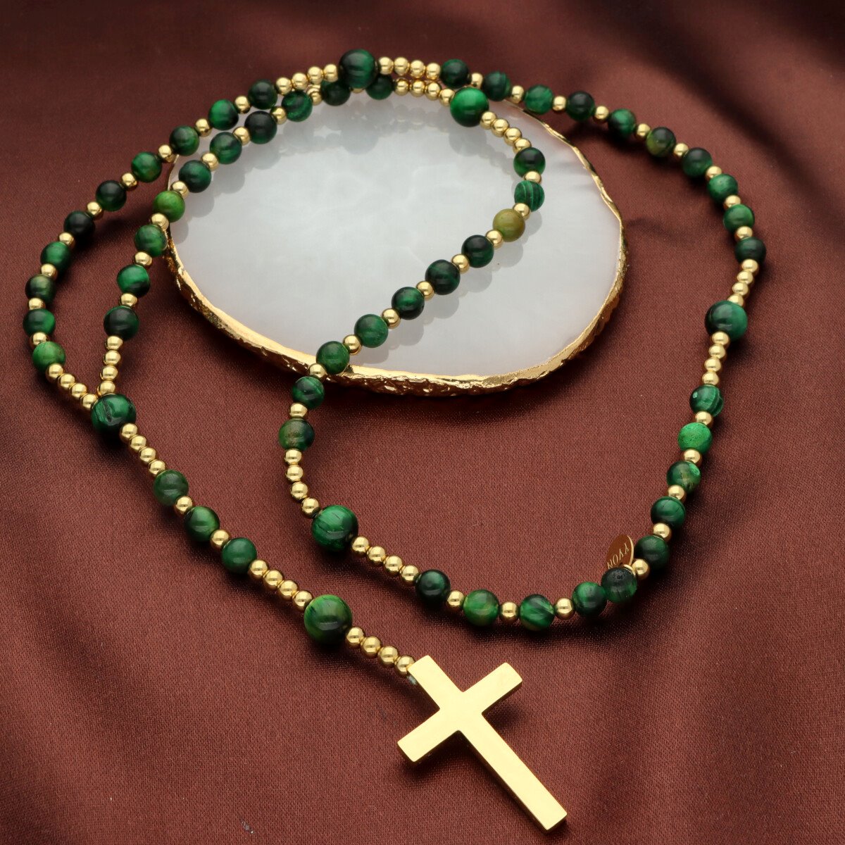 Różaniec wykonany ze stali szlachetnej złoconej i kamieni naturalnych (tygrysie oko zielone). Wielkość kamieni: 6 i 8 mm Zestaw w eleganckim pudełku i z sakiewką GRATIS. Idealny pomysł na Komunię Świętą.