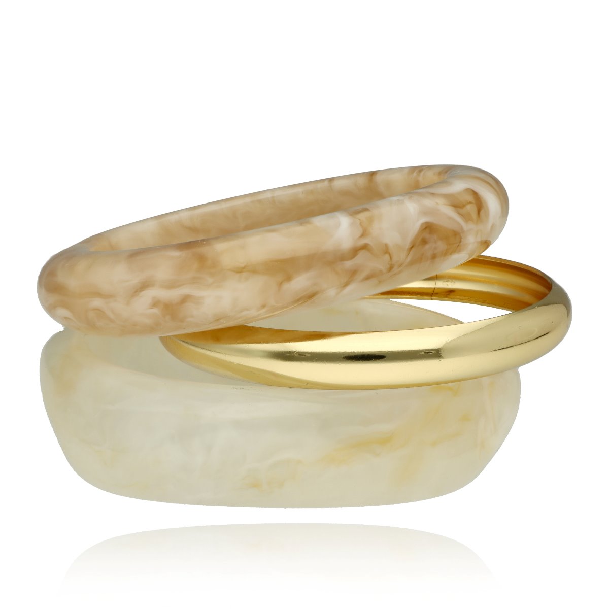 Zestawy bransolet YVON to wyraz nowoczesnej elegancji w wyjątkowo dopracowanej formie. Połączenie gładkiego, złotego metalu z dekoracyjną żywicą o subtelnym, marmurkowym efekcie tworzy kompozycję, która przyciąga uwagę, a jednocześnie pozostaje ponadczasowa. Każdy komplet został zaprojektowany tak, aby tworzyć spójną, stylową całość – różnorodność form i faktur nadaje bransoletkom unikatowego charakteru, a stonowana, klasyczna kolorystyka sprawia, że pasują zarówno do codziennych stylizacji, jak i bardziej eleganckich zestawień. Bransoletki wykonane są z metalu hipoalergicznego (zamak) oraz wysokiej jakości żywicy, dzięki czemu są komfortowe w noszeniu i przyjazne dla skóry. Standardowa średnica 6,5 cm zapewnia dobre dopasowanie do nadgarstka. Zestaw obejmuje wszystkie bransoletki widoczne na zdjęciu, tworząc gotową stylizację, która nie wymaga już żadnych dodatków – to biżuteria, która sama buduje cały look i nadaje mu wyrazistości.