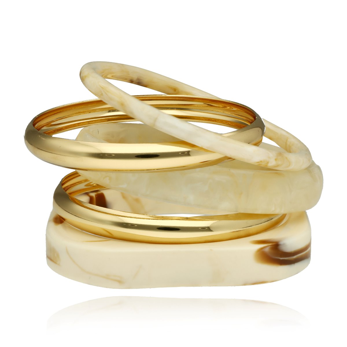 Zestawy bransolet YVON to wyraz nowoczesnej elegancji w wyjątkowo dopracowanej formie. Połączenie gładkiego, złotego metalu z dekoracyjną żywicą o subtelnym, marmurkowym efekcie tworzy kompozycję, która przyciąga uwagę, a jednocześnie pozostaje ponadczasowa. Każdy komplet został zaprojektowany tak, aby tworzyć spójną, stylową całość – różnorodność form i faktur nadaje bransoletkom unikatowego charakteru, a stonowana, klasyczna kolorystyka sprawia, że pasują zarówno do codziennych stylizacji, jak i bardziej eleganckich zestawień. Bransoletki wykonane są z metalu hipoalergicznego (zamak) oraz wysokiej jakości żywicy, dzięki czemu są komfortowe w noszeniu i przyjazne dla skóry. Standardowa średnica 6,5 cm zapewnia dobre dopasowanie do nadgarstka. Zestaw obejmuje wszystkie bransoletki widoczne na zdjęciu, tworząc gotową stylizację, która nie wymaga już żadnych dodatków – to biżuteria, która sama buduje cały look i nadaje mu wyrazistości.