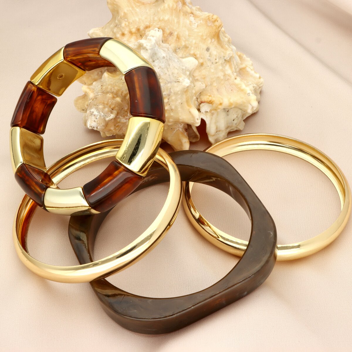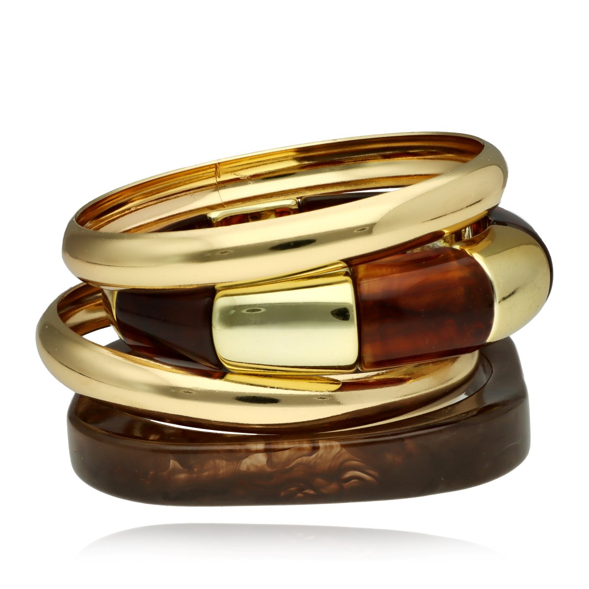 Zestawy bransolet YVON to wyraz nowoczesnej elegancji w wyjątkowo dopracowanej formie. Połączenie gładkiego, złotego metalu z dekoracyjną żywicą o subtelnym, marmurkowym efekcie tworzy kompozycję, która przyciąga uwagę, a jednocześnie pozostaje ponadczasowa. Każdy komplet został zaprojektowany tak, aby tworzyć spójną, stylową całość – różnorodność form i faktur nadaje bransoletkom unikatowego charakteru, a stonowana, klasyczna kolorystyka sprawia, że pasują zarówno do codziennych stylizacji, jak i bardziej eleganckich zestawień. Bransoletki wykonane są z metalu hipoalergicznego (zamak) oraz wysokiej jakości żywicy, dzięki czemu są komfortowe w noszeniu i przyjazne dla skóry. Standardowa średnica 6,5 cm zapewnia dobre dopasowanie do nadgarstka. Zestaw obejmuje wszystkie bransoletki widoczne na zdjęciu, tworząc gotową stylizację, która nie wymaga już żadnych dodatków – to biżuteria, która sama buduje cały look i nadaje mu wyrazistości.