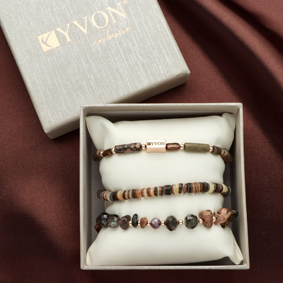 Zestaw trzech bransoletek z KAMIENIAMI NATURALNYMI (rodonit, jaspis leopardzi, muszla), który łączy w sobie klasyczną elegancję i najwyższą jakość wykonania. Każdy element został starannie dobrany – od antyalergicznego mosiądzu, przez elementy z kamieni, aż po misternie fasetowane koraliki z kryształu górskiego. Subtelne połączenie tych materiałów tworzy niepowtarzalny, ponadczasowy dodatek. Bransoletki zapakowane są w eleganckie pudełeczko z miękką poduszeczką, co sprawia, że zestaw doskonale nadaje się na prezent.