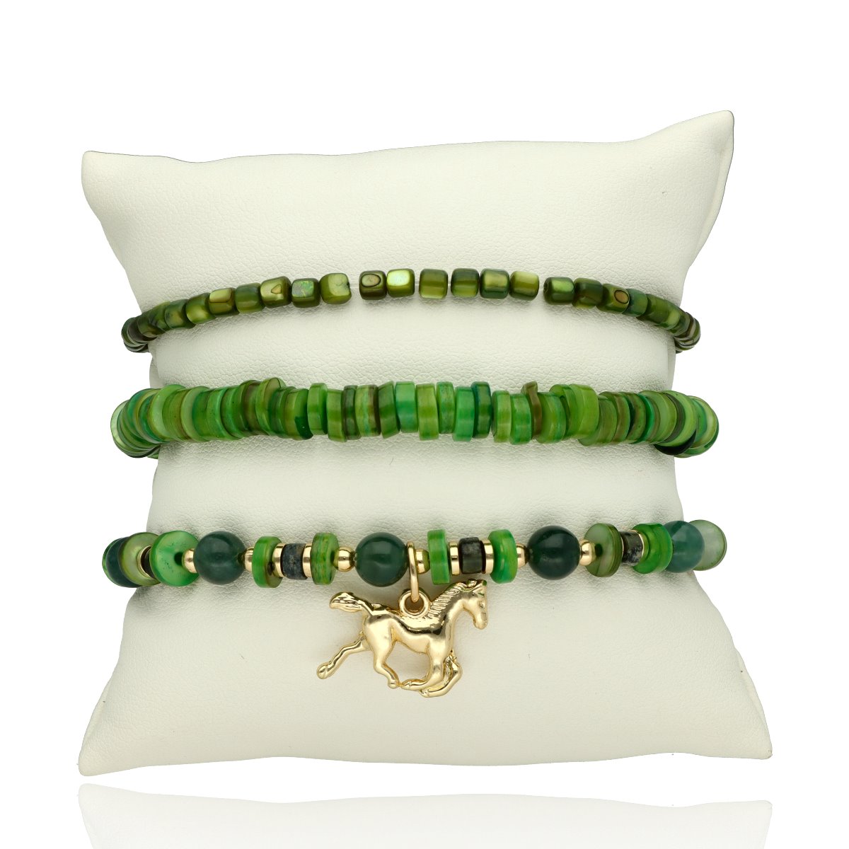Zestaw trzech bransoletek z KAMIENIAMI NATURALNYMI (awenturyn zielony, muszla), który łączy w sobie klasyczną elegancję i najwyższą jakość wykonania. Każdy element został starannie dobrany – od antyalergicznego mosiądzu, przez elementy z kamieni, aż po misternie fasetowane koraliki z kryształu górskiego. Subtelne połączenie tych materiałów tworzy niepowtarzalny, ponadczasowy dodatek. Bransoletki zapakowane są w eleganckie pudełeczko z miękką poduszeczką, co sprawia, że zestaw doskonale nadaje się na prezent.