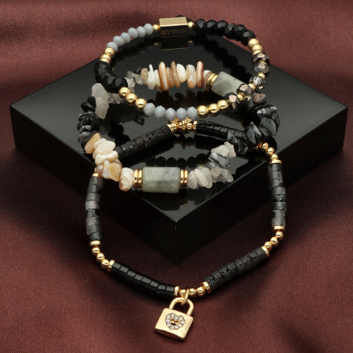 Zestaw trzech bransoletek z KAMIENIAMI NATURALNYMI (KWARC TURMALINOWY) i MUSZLĄ NATURALNĄ który łączy w sobie klasyczną elegancję i najwyższą jakość wykonania. Każdy element został starannie dobrany – od antyalergicznego mosiądzu, przez elementy z kamieni i muszli, aż po misternie fasetowane koraliki z kryształu górskiego. Subtelne połączenie tych materiałów tworzy niepowtarzalny, ponadczasowy dodatek.
