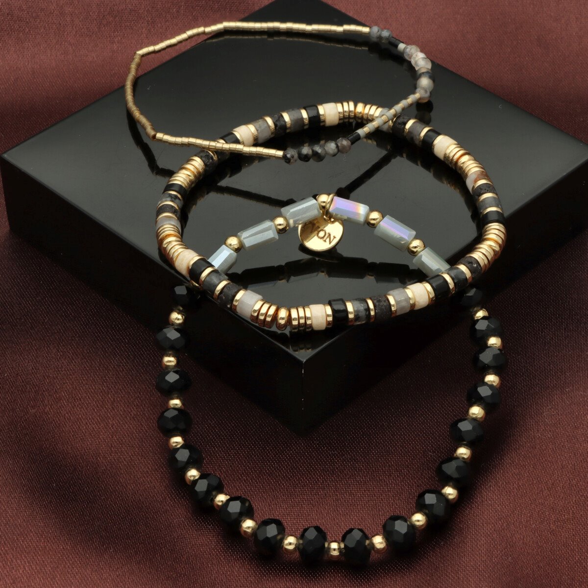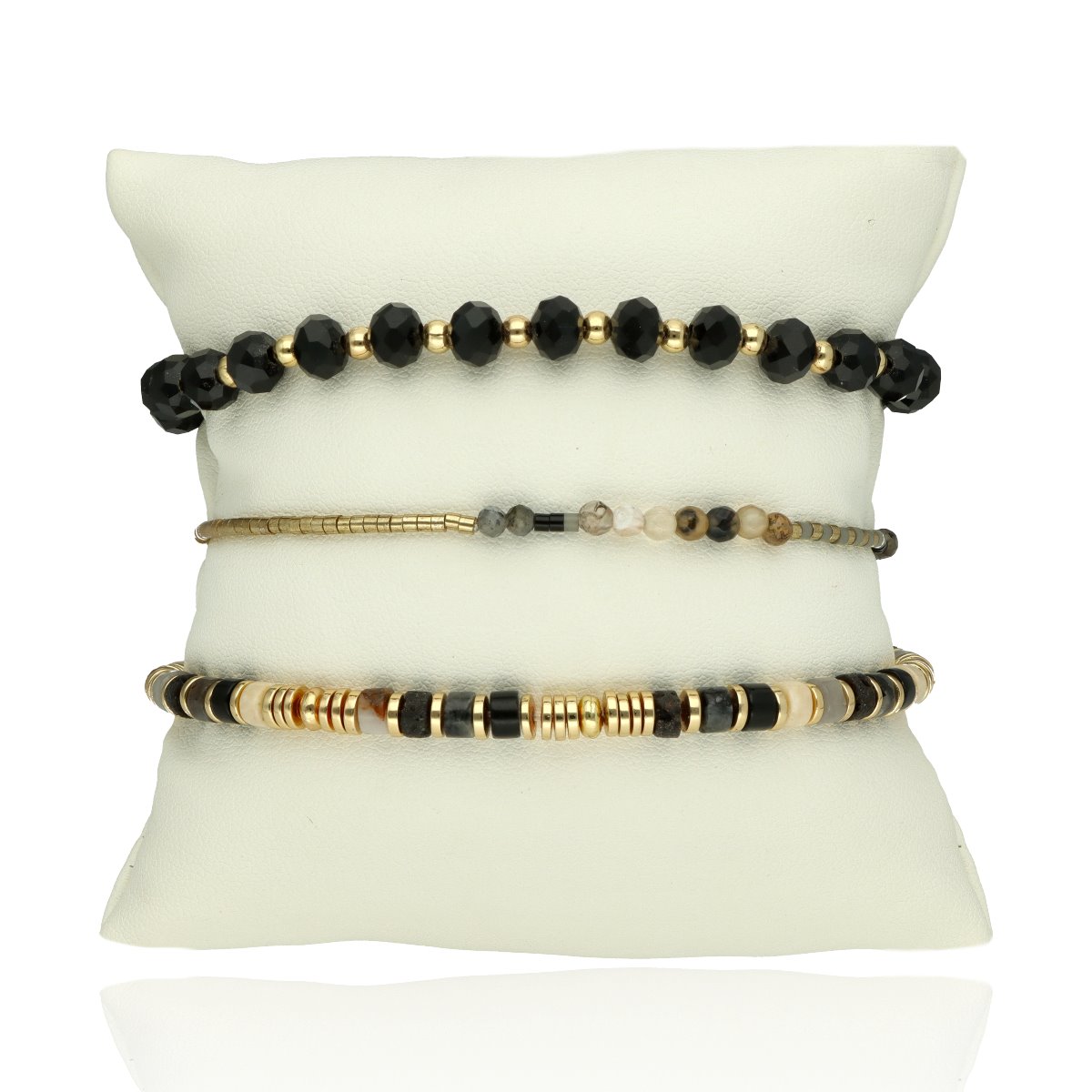 Zestaw trzech bransoletek z KAMIENIAMI NATURALNYMI (agat biały, howlit, agat koronkowy czarny), który łączy w sobie klasyczną elegancję i najwyższą jakość wykonania. Każdy element został starannie dobrany – od antyalergicznego mosiądzu, przez elementy z kamieni, aż po misternie fasetowane koraliki z kryształu górskiego. Subtelne połączenie tych materiałów tworzy niepowtarzalny, ponadczasowy dodatek.
