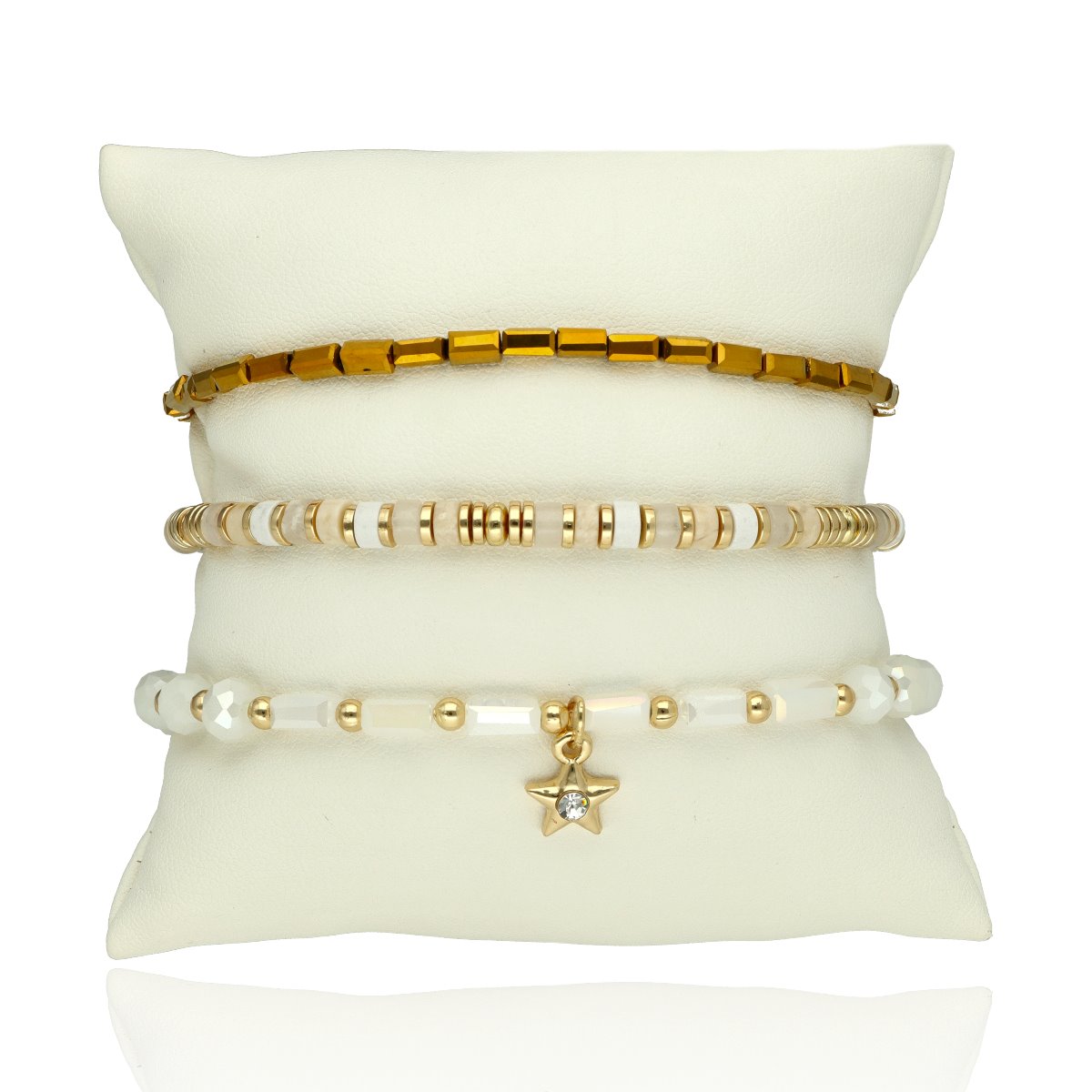 Zestaw trzech bransoletek z KAMIENIAMI NATURALNYMI (agat biały, howlit), który łączy w sobie klasyczną elegancję i najwyższą jakość wykonania. Każdy element został starannie dobrany – od antyalergicznego mosiądzu, przez elementy z kamieni, aż po misternie fasetowane koraliki z kryształu górskiego. Subtelne połączenie tych materiałów tworzy niepowtarzalny, ponadczasowy dodatek.