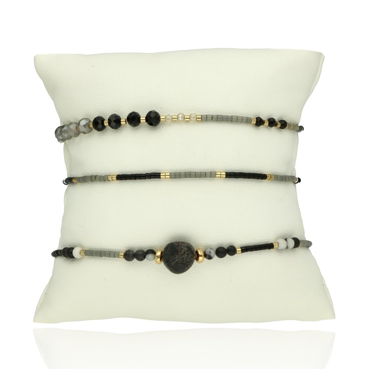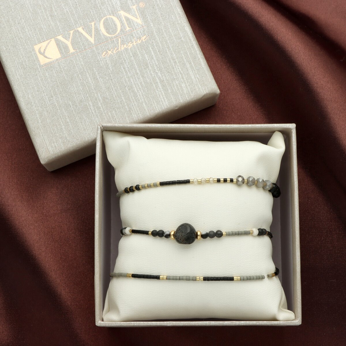 Zestaw trzech bransoletek z KAMIENIAMI NATURALNYMI (kwarc dymny, magnezyt), koralikami MIYUKI, który łączy w sobie klasyczną elegancję i najwyższą jakość wykonania. Każdy element został starannie dobrany – od antyalergicznego mosiądzu, przez elementy z kamieni, aż po misternie oryginalne japońskie koraliki Miyuki. Subtelne połączenie tych materiałów tworzy niepowtarzalny, ponadczasowy dodatek. Bransoletki zapakowane są w eleganckie pudełeczko z miękką poduszeczką, co sprawia, że zestaw doskonale nadaje się na prezent.