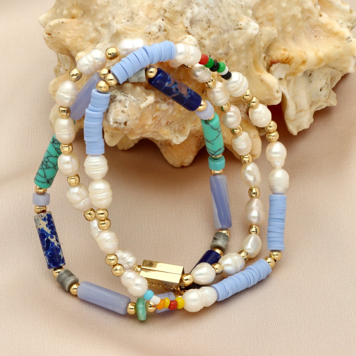 Zestaw trzech bransoletek z hipoalergicznego mosiadzu, z perłami naturalnymi i kamieniami naturalnymi: awenturyn, lapis lazuli oraz ze szkłem kryształowym.