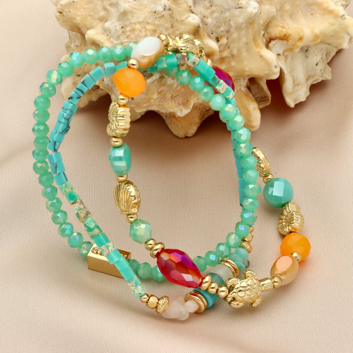 Zestaw trzech bransoletek z hipoalergicznego mosiadzu i szkła kryształowego.