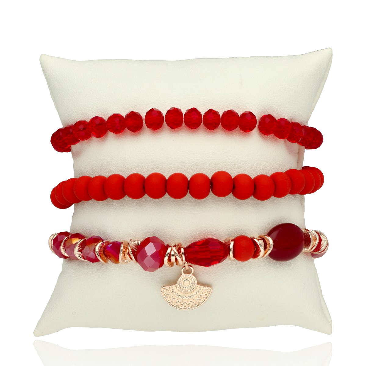 Zestaw trzech bransoletek z hipoalergicznego mosiadzu, szkła kryształowego i KAMIENI NATURALNYCH: kwarc hematoidowy czerwony, oraz kompozytu jubilerskiego.