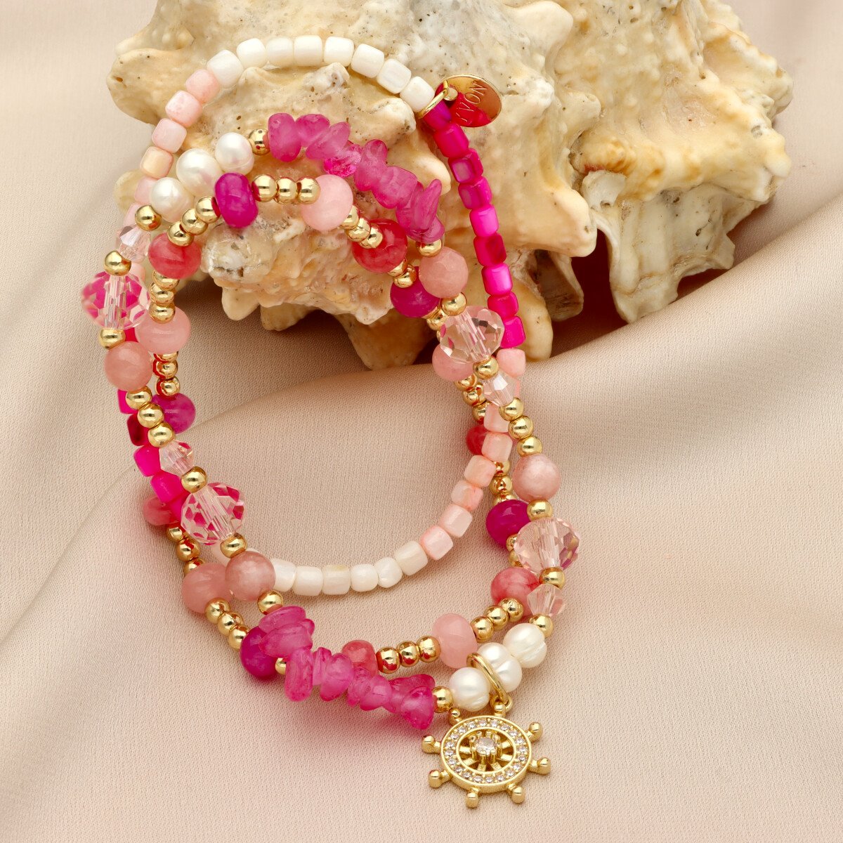 Zestaw trzech bransoletek z hipoalergicznego mosiadzu, szkła kryształowego i KAMIENI NATURALNYCH: marmur, rubelit, howlit oraz pereł i muszli naturalnych.