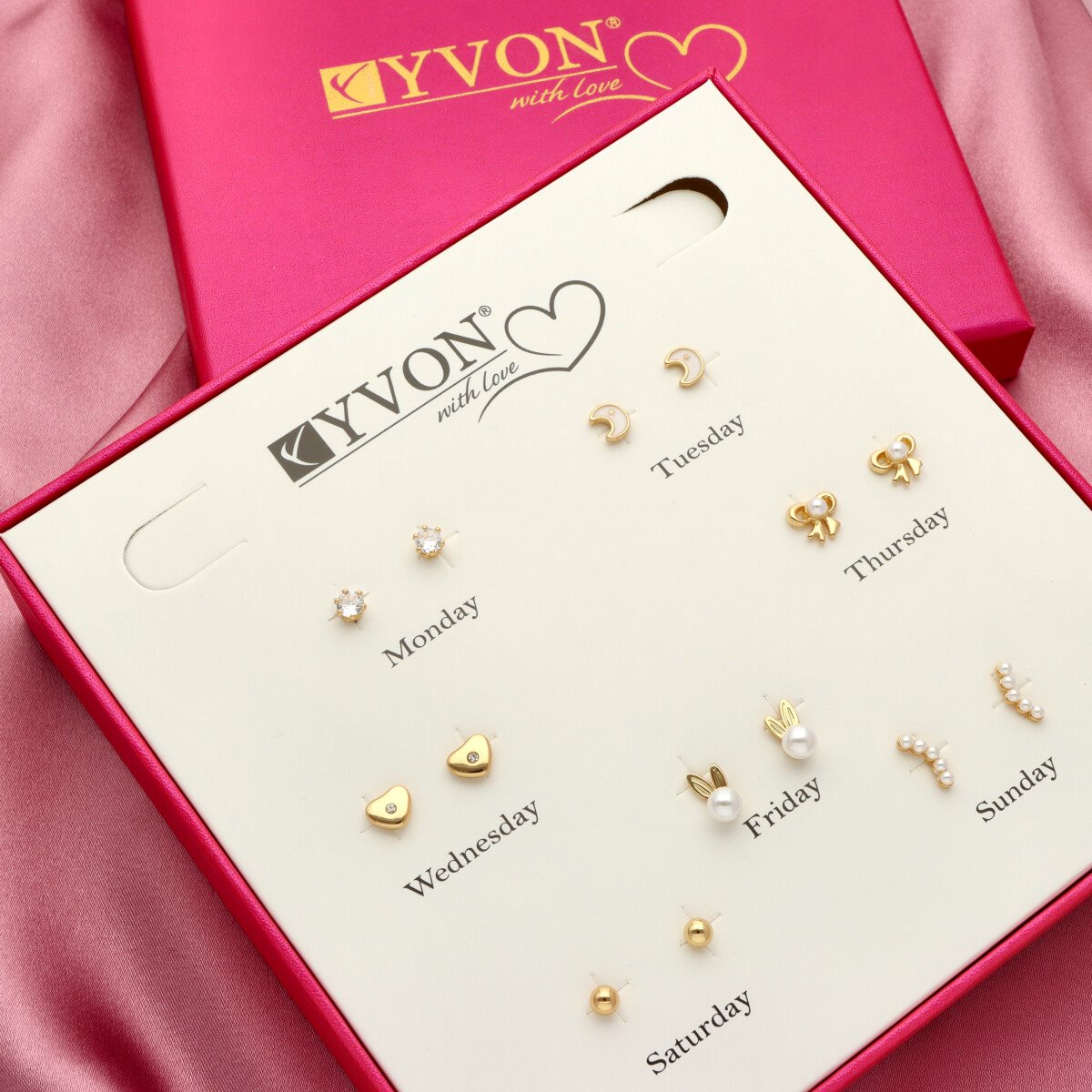 Zestaw 7 par kolczyków na każdy dzień tygodnia to kobiecy, dopracowany komplet, który pozwala dopasować biżuterię do nastroju i stylizacji. W eleganckim pudełku znajdują się subtelne wzory – od minimalistycznych kulek, przez kokardki i kółka, aż po motywy ozdobione cyrkoniami. Kolczyki zostały wykonane z mosiądzu pozłacanego i ozdobione lśniącymi cyrkoniami, które pięknie odbijają światło i nadają biżuterii delikatnego blasku. To idealny wybór zarówno do codziennych stylizacji, jak i na wyjątkowe okazje. Eleganckie opakowanie z podziałem na dni tygodnia podkreśla koncepcję „kolczyki na każdy dzień”. Materiał: mosiądz pozłacany Zdobienie: cyrkonie Zapięcie: sztyft Ilość par w zestawie: 7