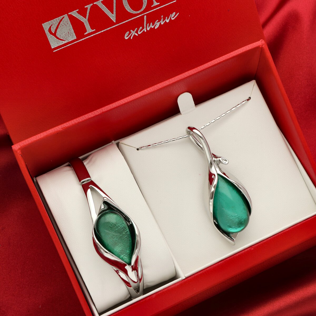 Naszyjnik i bransoleta tworzą spójny, harmonijny komplet, idealny do eleganckich stylizacji i wieczorowych zestawów. Każdy zestaw pakowany jest w duże, ekskluzywne pudełko prezentowe YVON, zaprojektowane tak, aby pomieścić cały komplet i podkreślić jego luksusowy charakter.