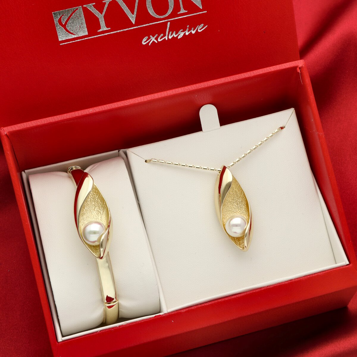 Naszyjnik i bransoleta tworzą spójny, harmonijny komplet, idealny do eleganckich stylizacji i wieczorowych zestawów. Każdy zestaw pakowany jest w duże, ekskluzywne pudełko prezentowe YVON, zaprojektowane tak, aby pomieścić cały komplet i podkreślić jego luksusowy charakter.
