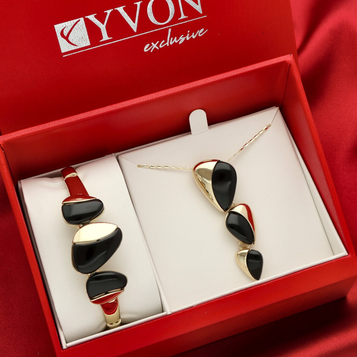 Naszyjnik i bransoleta tworzą spójny, harmonijny komplet, idealny do eleganckich stylizacji i wieczorowych zestawów. Każdy zestaw pakowany jest w duże, ekskluzywne pudełko prezentowe YVON, zaprojektowane tak, aby pomieścić cały komplet i podkreślić jego luksusowy charakter.