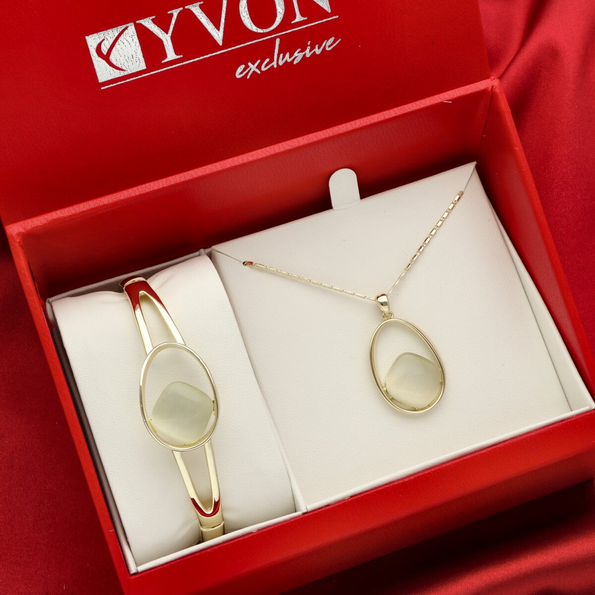 Ekskluzywny komplet biżuterii z linii YVON Exclusive, składający się z eleganckiego naszyjnika oraz dopasowanej bransolety. Zestaw wykonany jest z hipoalergicznego stopu cynku (zamak) oraz KWARCU. Starannie polerowane elementy nadają biżuterii nowoczesny, luksusowy charakter, jednocześnie zachowując lekkość i komfort noszenia. Naszyjnik i bransoleta tworzą spójny, harmonijny komplet, idealny do eleganckich stylizacji i wieczorowych zestawów. Każdy zestaw pakowany jest w duże, ekskluzywne pudełko prezentowe YVON, zaprojektowane tak, aby pomieścić cały komplet i podkreślić jego luksusowy charakter.