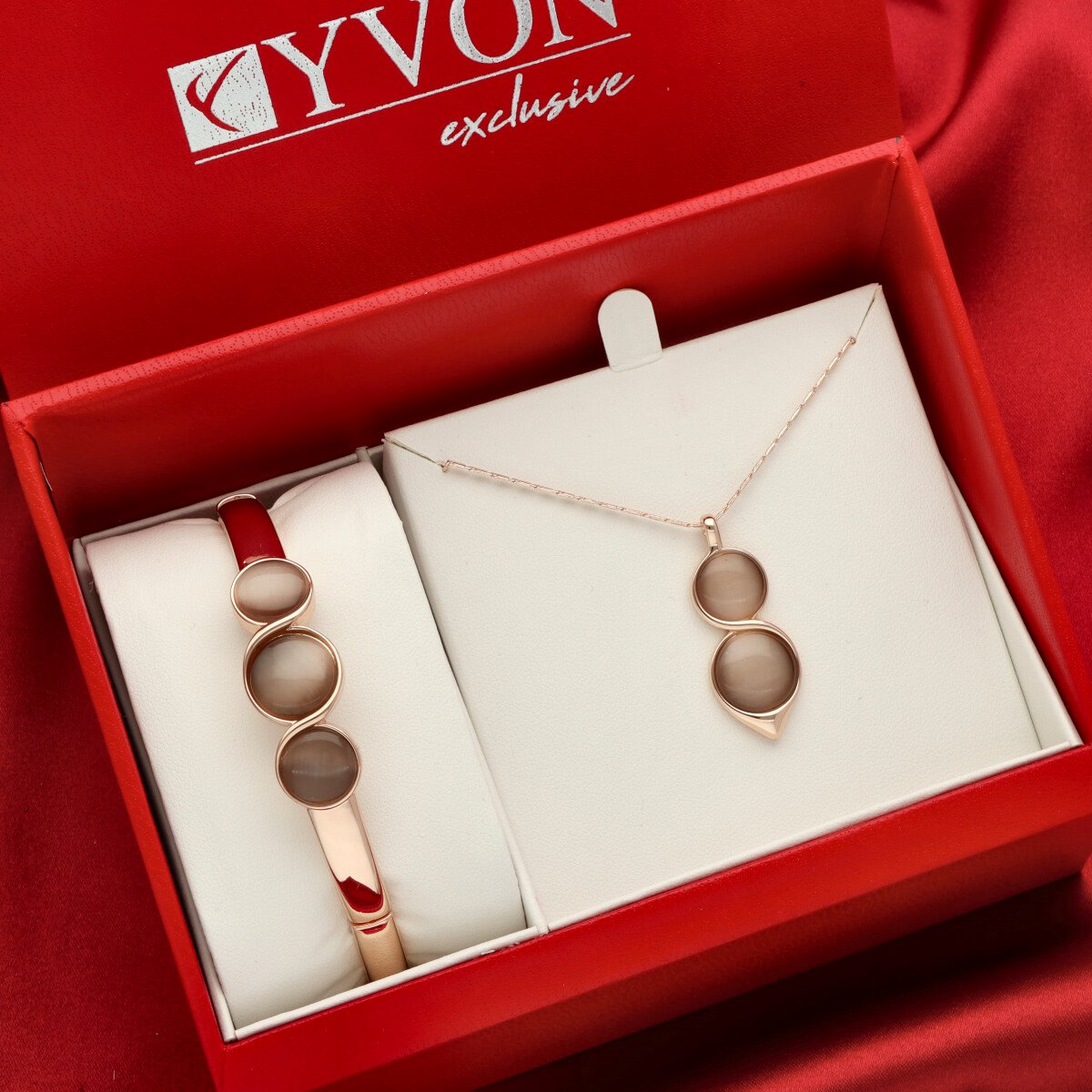 Ekskluzywny komplet biżuterii z linii YVON Exclusive, składający się z eleganckiego naszyjnika oraz dopasowanej bransolety. Zestaw wykonany jest z hipoalergicznego stopu cynku (zamak) oraz KWARCU. Starannie polerowane elementy nadają biżuterii nowoczesny, luksusowy charakter, jednocześnie zachowując lekkość i komfort noszenia. Naszyjnik i bransoleta tworzą spójny, harmonijny komplet, idealny do eleganckich stylizacji i wieczorowych zestawów. Każdy zestaw pakowany jest w duże, ekskluzywne pudełko prezentowe YVON, zaprojektowane tak, aby pomieścić cały komplet i podkreślić jego luksusowy charakter.