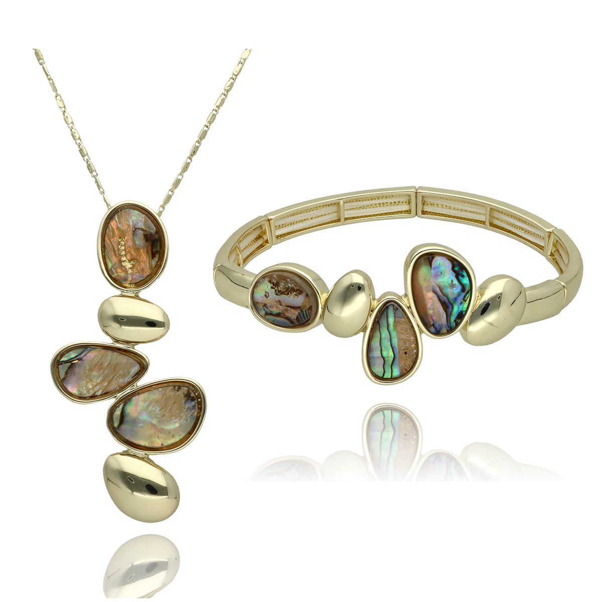 Ekskluzywny komplet biżuterii z linii YVON Exclusive, składający się z eleganckiego naszyjnika oraz dopasowanej bransolety. Zestaw wykonany jest z hipoalergicznego stopu cynku (zamak) oraz MUSZLI NATURALNEJ ABALONE. Starannie polerowane elementy nadają biżuterii nowoczesny, luksusowy charakter, jednocześnie zachowując lekkość i komfort noszenia.