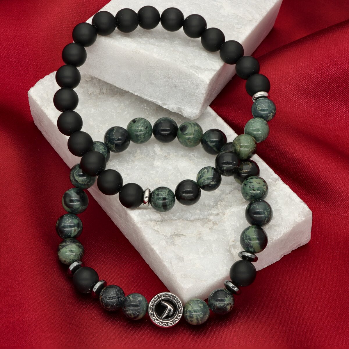 Zestaw męskich bransoletek wykonanych z naturalnych kamieni (agat czarny, jaspis zebra), z dodatkiem stali szlachetnej i hematytu – materiałów cenionych za trwałość, odporność i elegancki wygląd. Każdy zestaw zawiera dwie bransoletki, które doskonale komponują się ze sobą kolorystycznie i stylistycznie – możesz je nosić razem lub osobno.