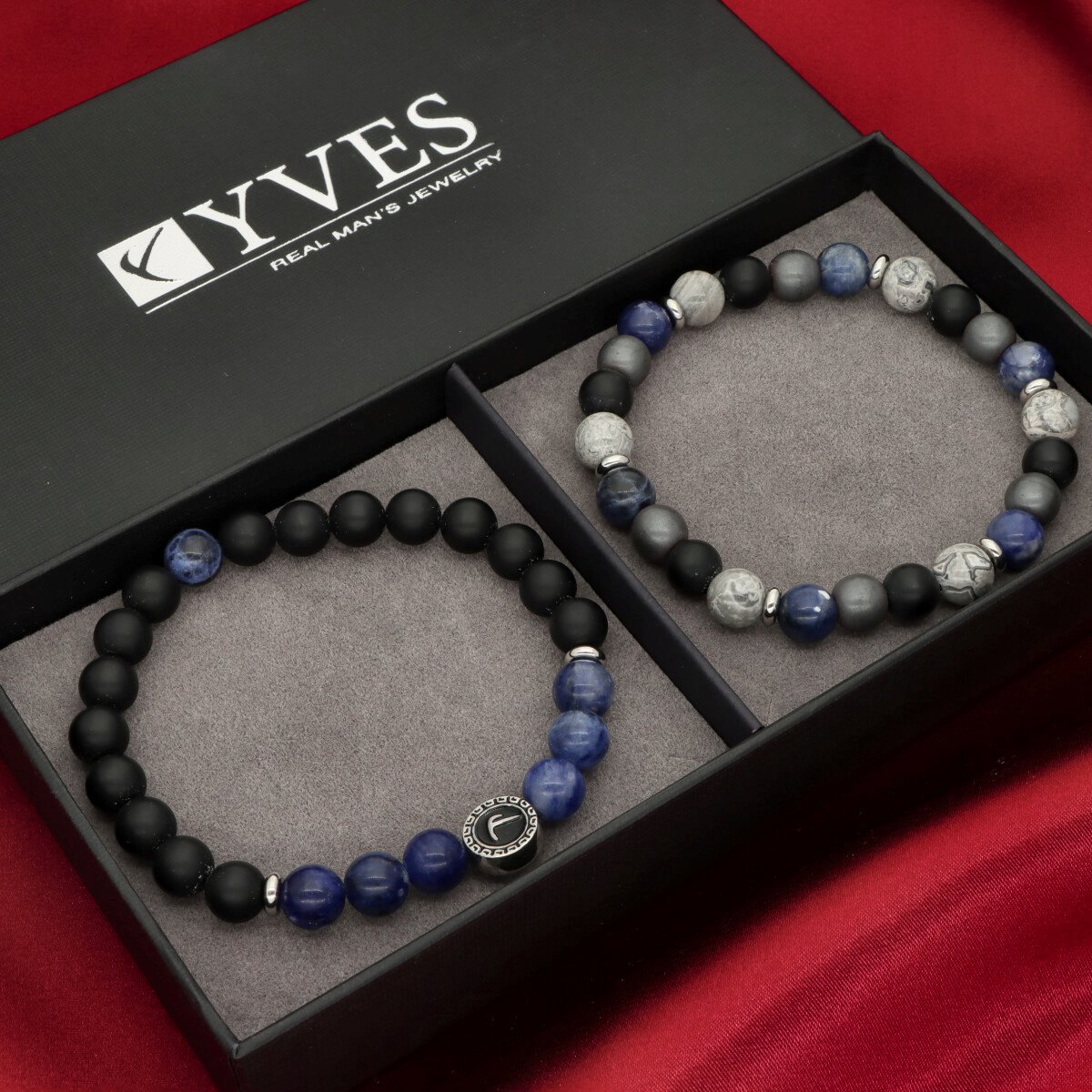 Bransoletki osadzone są na elastycznej, mocnej lince, dzięki czemu dopasowują się do nadgarstka. Całość zapakowana w stylowe, czarne pudełko sygnowane logo YVES – Real Man's Jewelry.
