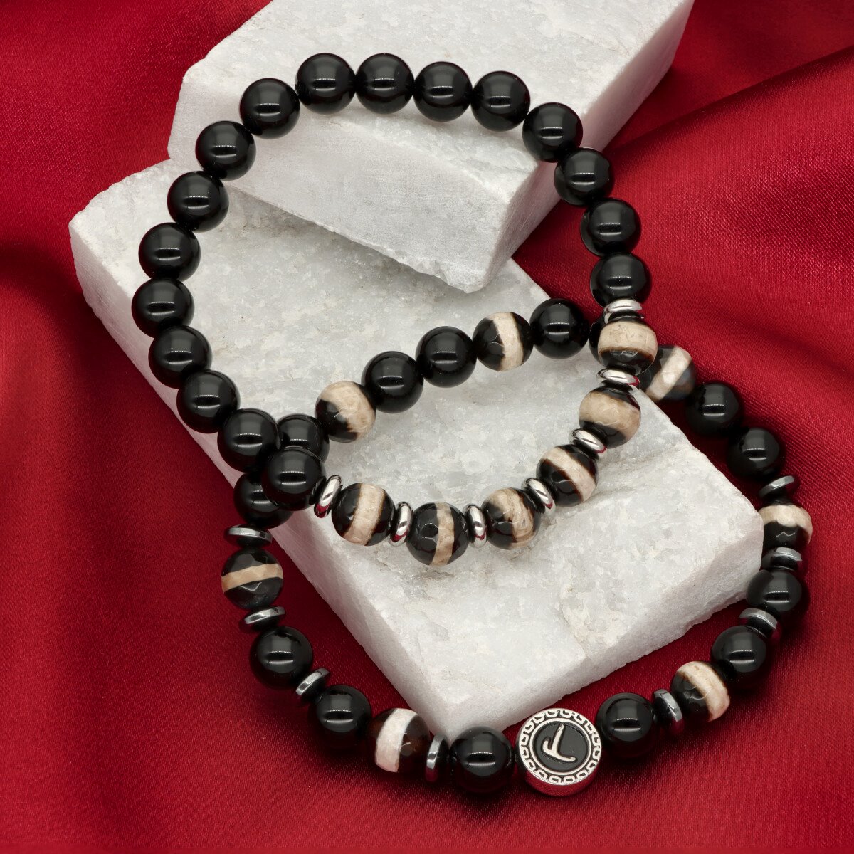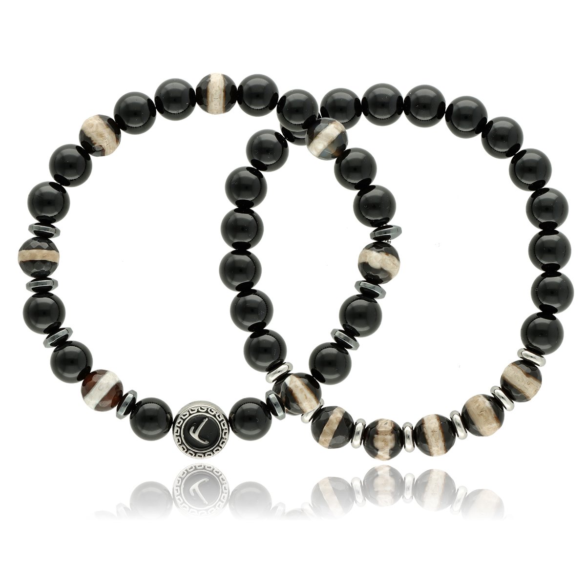 Zestaw męskich bransoletek wykonanych z naturalnych kamieni (agat czarny, kamień "oko"), z dodatkiem stali szlachetnej i hematytu – materiałów cenionych za trwałość, odporność i elegancki wygląd. Każdy zestaw zawiera dwie bransoletki, które doskonale komponują się ze sobą kolorystycznie i stylistycznie – możesz je nosić razem lub osobno.