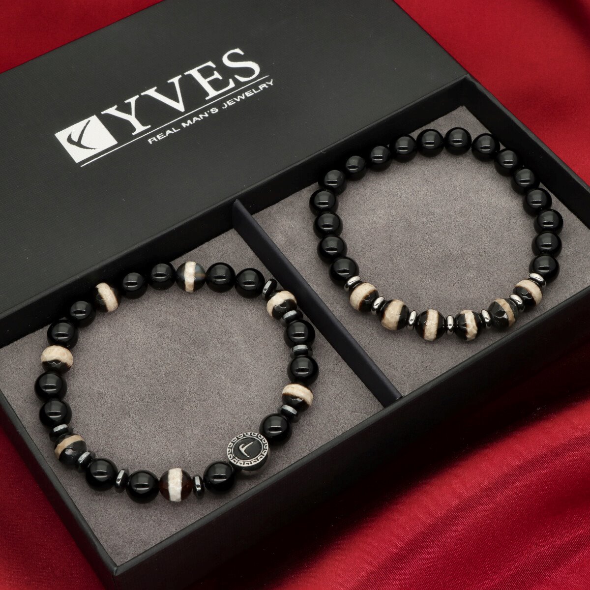 Bransoletki osadzone są na elastycznej, mocnej lince, dzięki czemu dopasowują się do nadgarstka. Całość zapakowana w stylowe, czarne pudełko sygnowane logo YVES – Real Man's Jewelry.