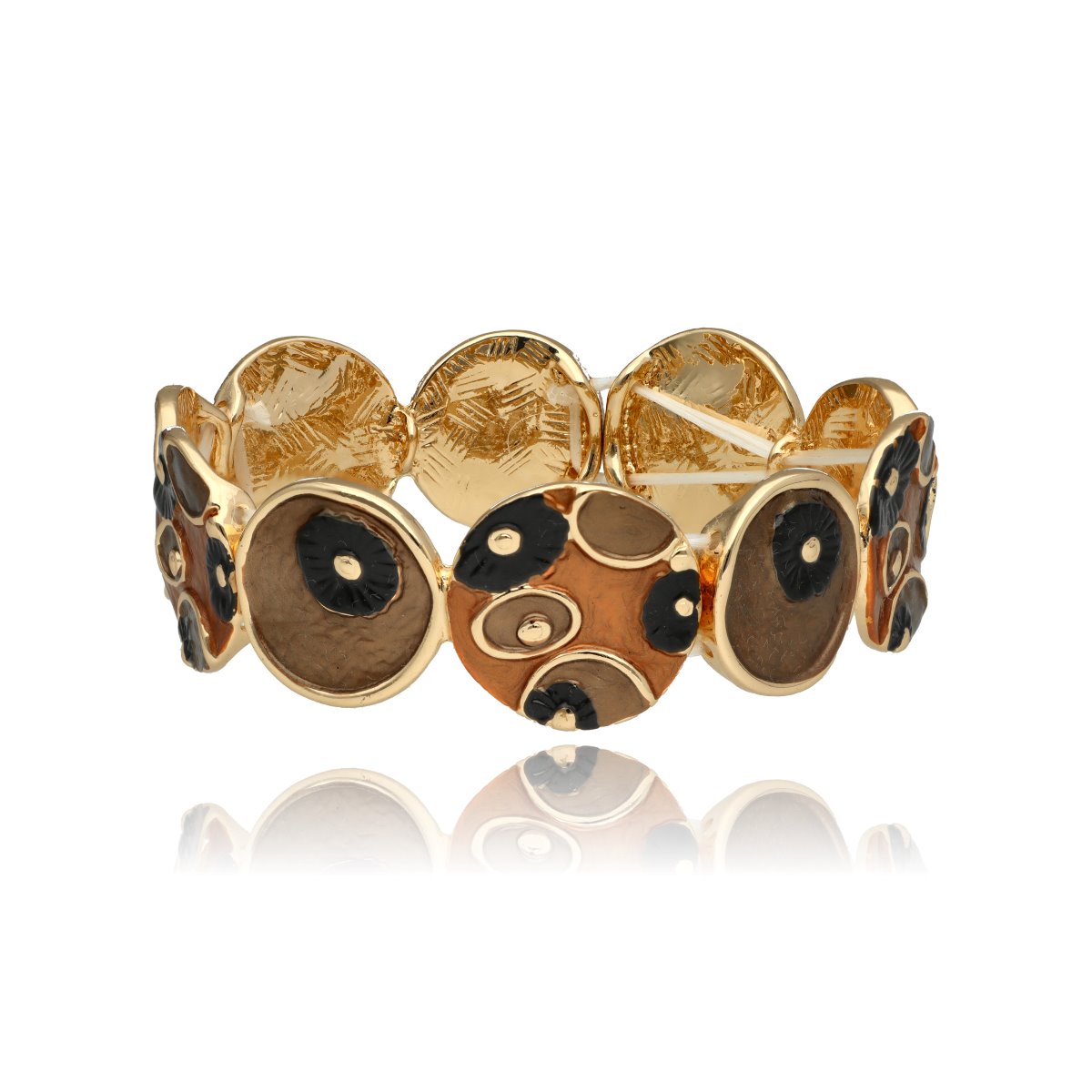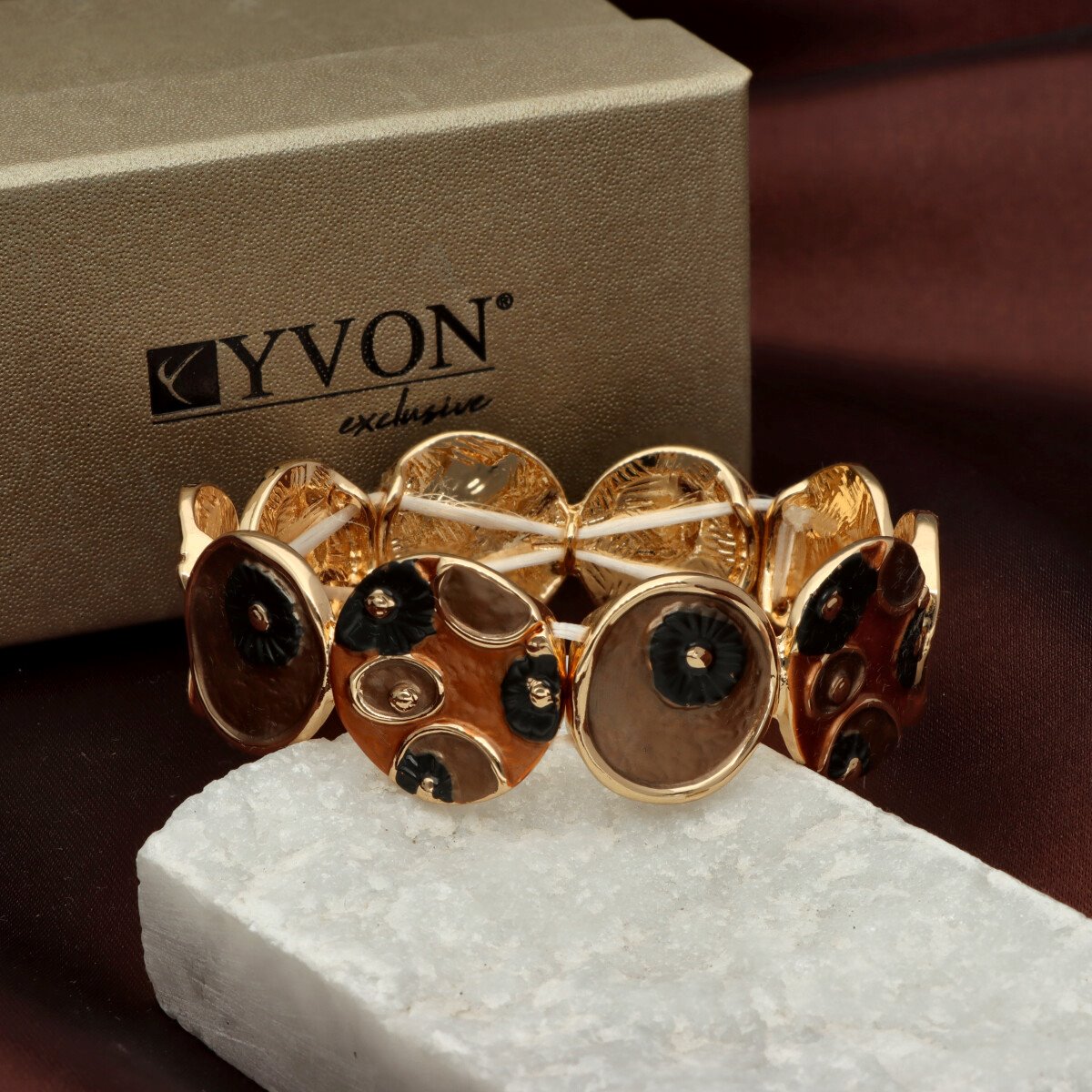 Bransoleta z kolekcji YVON biżuteria artystyczna, wykonana z metalu hipoalergicznego, zdobiona emaliowanymi elementami. Konstrukcja oparta na elastycznych gumeczkach dopasowuje się do każdego nadgarstka, zapewniając komfort noszenia. Wykończona z dbałością o detale, zachwyca artystycznym wzornictwem. Zapakowana w eleganckie pudełko prezentowe YVON – doskonały wybór zarówno do codziennych, jak i wieczorowych stylizacji.