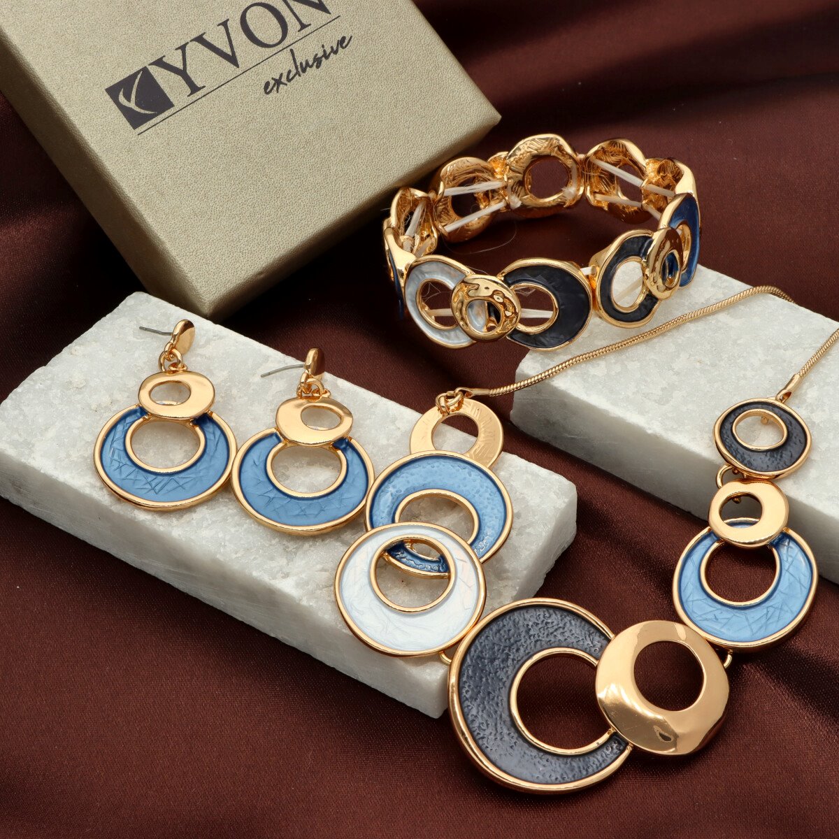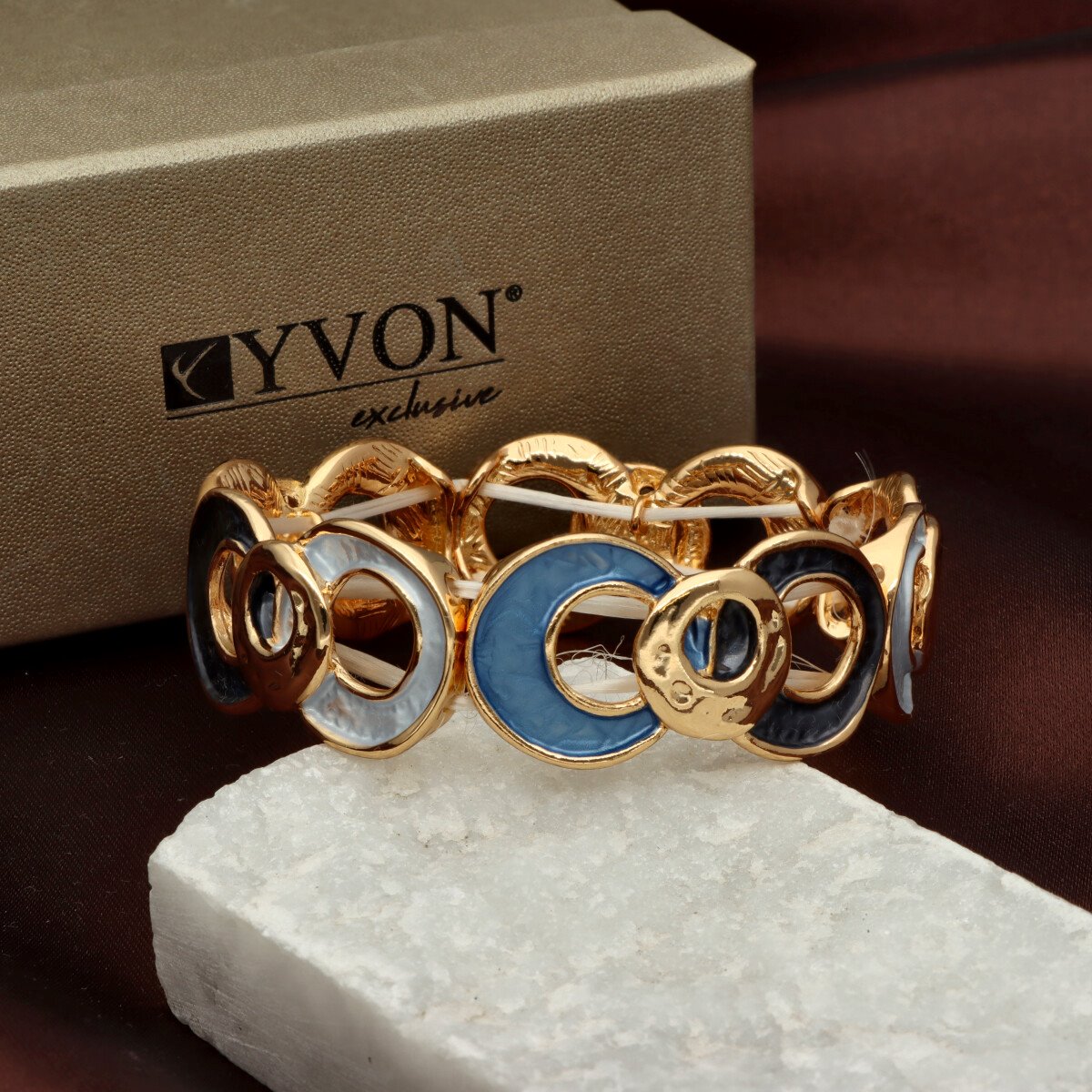 Bransoleta z kolekcji YVON BIŻUTERIA ARTYSTYCZNA, wykonana z metalu hipoalergicznego i zdobiona emaliowanymi elementami. Konstrukcja oparta na elastycznych gumeczkach dopasowuje się do każdego nadgarstka, zapewniając komfort noszenia. Wykończona z dbałością o detale, zachwyca artystycznym wzornictwem. Zapakowana w eleganckie pudełko prezentowe YVON – doskonały wybór zarówno do codziennych, jak i wieczorowych stylizacji.