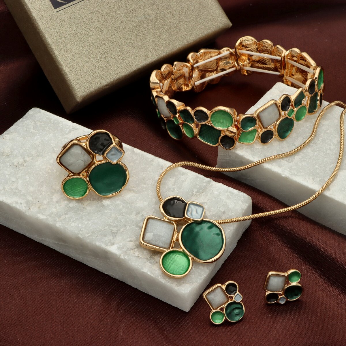 Bransoleta z kolekcji YVON BIŻUTERIA ARTYSTYCZNA, wykonana z metalu hipoalergicznego i zdobiona emaliowanymi elementami. Konstrukcja oparta na elastycznych gumeczkach dopasowuje się do każdego nadgarstka, zapewniając komfort noszenia. Wykończona z dbałością o detale, zachwyca artystycznym wzornictwem. Zapakowana w eleganckie pudełko prezentowe YVON – doskonały wybór zarówno do codziennych, jak i wieczorowych stylizacji.