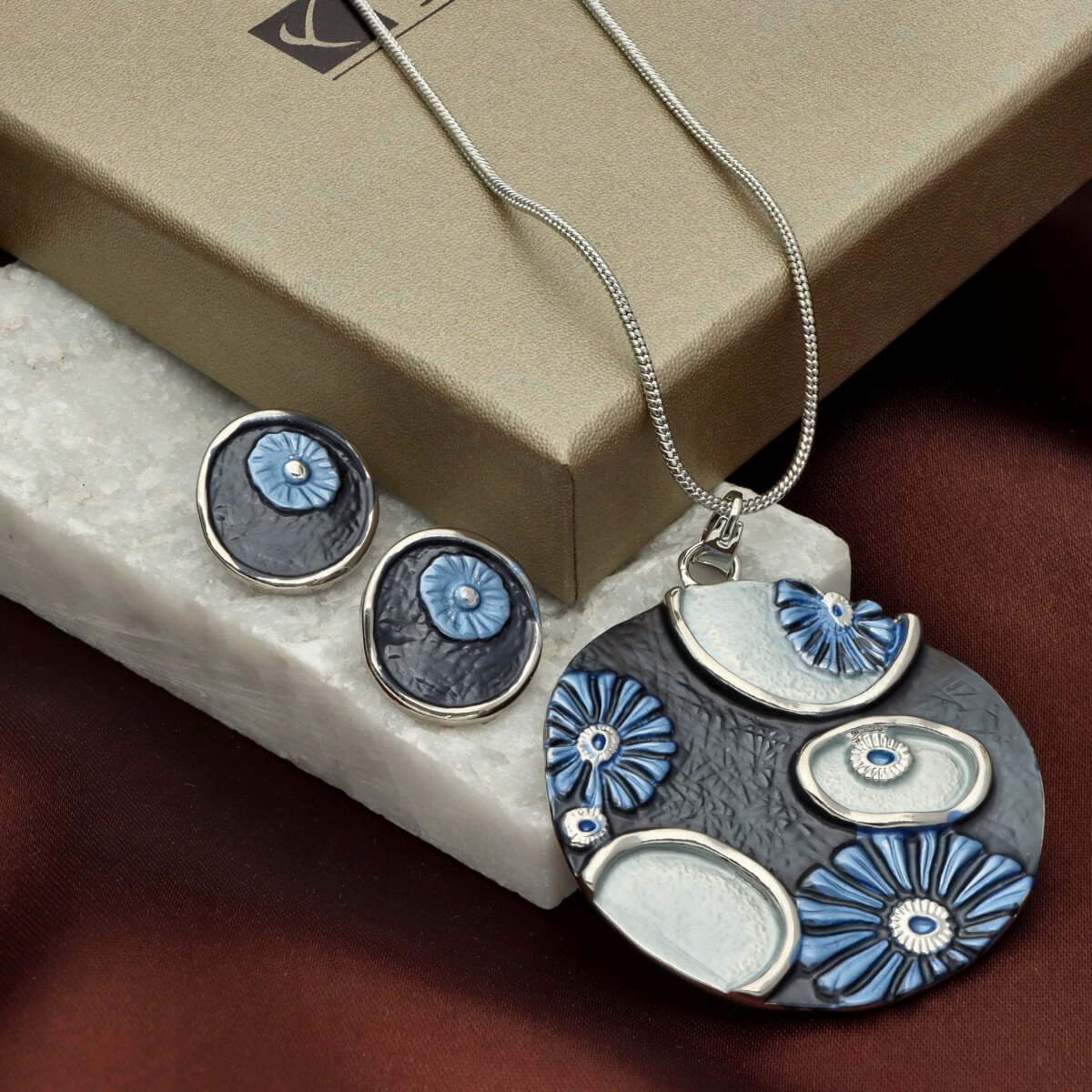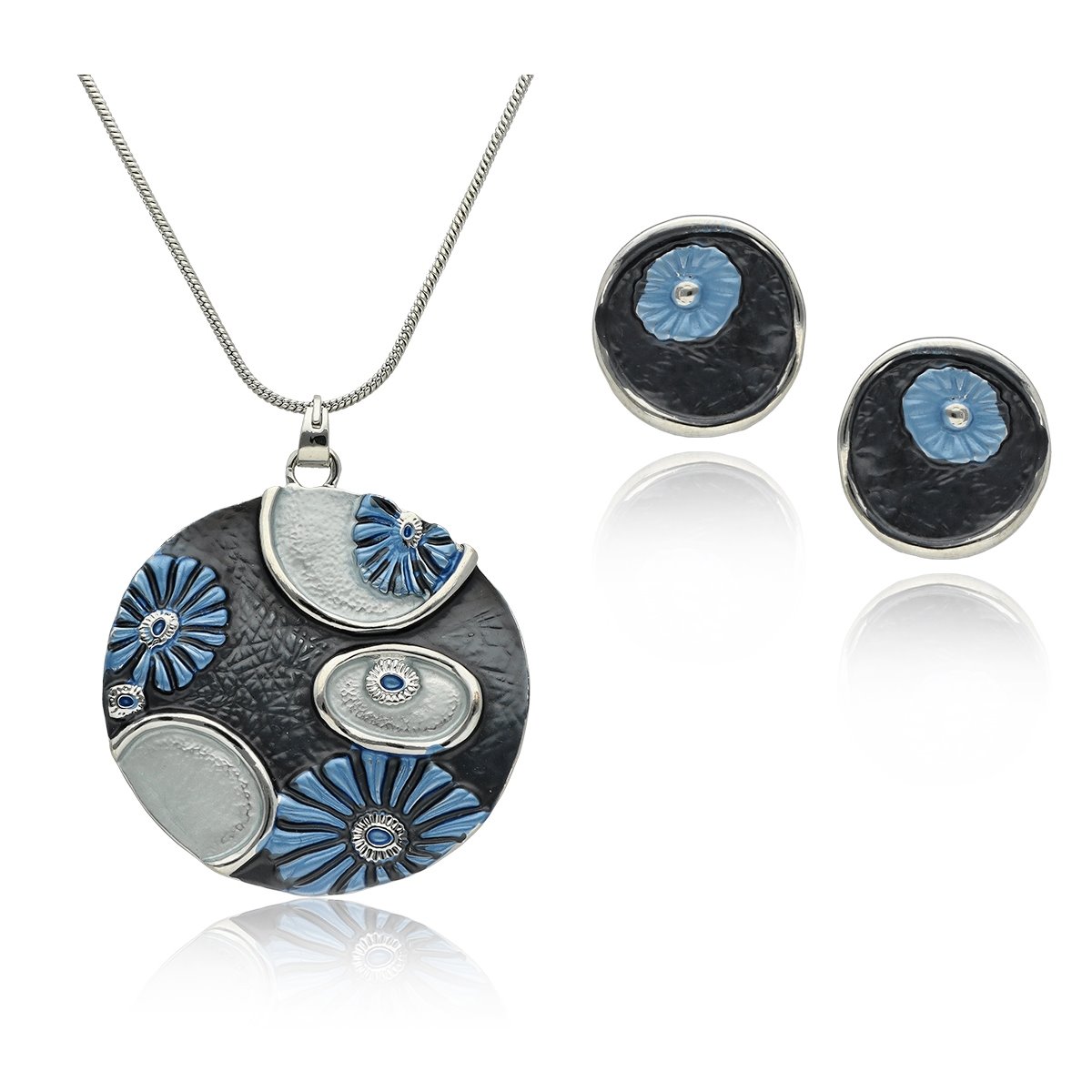 Komplet z kolekcji YVON biżuteria artystyczna, wykonany z metalu hipoalergicznego, pozbawionego niklu i ołowiu. Zdobiony emaliowanymi elementami, które tworzą elegancką, harmonijną kompozycję. Naszyjnik o długości 42 cm z możliwością regulacji o dodatkowe 8 cm, idealnie układa się na dekolcie. Kolczyki na wygodnym zapięciu typu sztyft. Całość zapakowana w eleganckie pudełko prezentowe YVON. To wyjątkowy komplet, który podkreśla kobiecą klasę i artystyczne wyczucie stylu.
