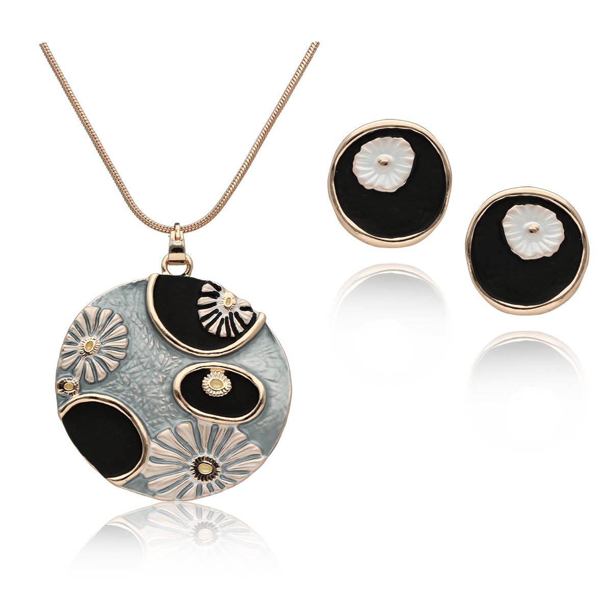 Komplet z kolekcji YVON biżuteria artystyczna, wykonany z metalu hipoalergicznego, pozbawionego niklu i ołowiu. Zdobiony emaliowanymi elementami, które tworzą elegancką, harmonijną kompozycję. Naszyjnik o długości 42 cm z możliwością regulacji o dodatkowe 8 cm, idealnie układa się na dekolcie. Kolczyki na wygodnym zapięciu typu sztyft. Całość zapakowana w eleganckie pudełko prezentowe YVON. To wyjątkowy komplet, który podkreśla kobiecą klasę i artystyczne wyczucie stylu.