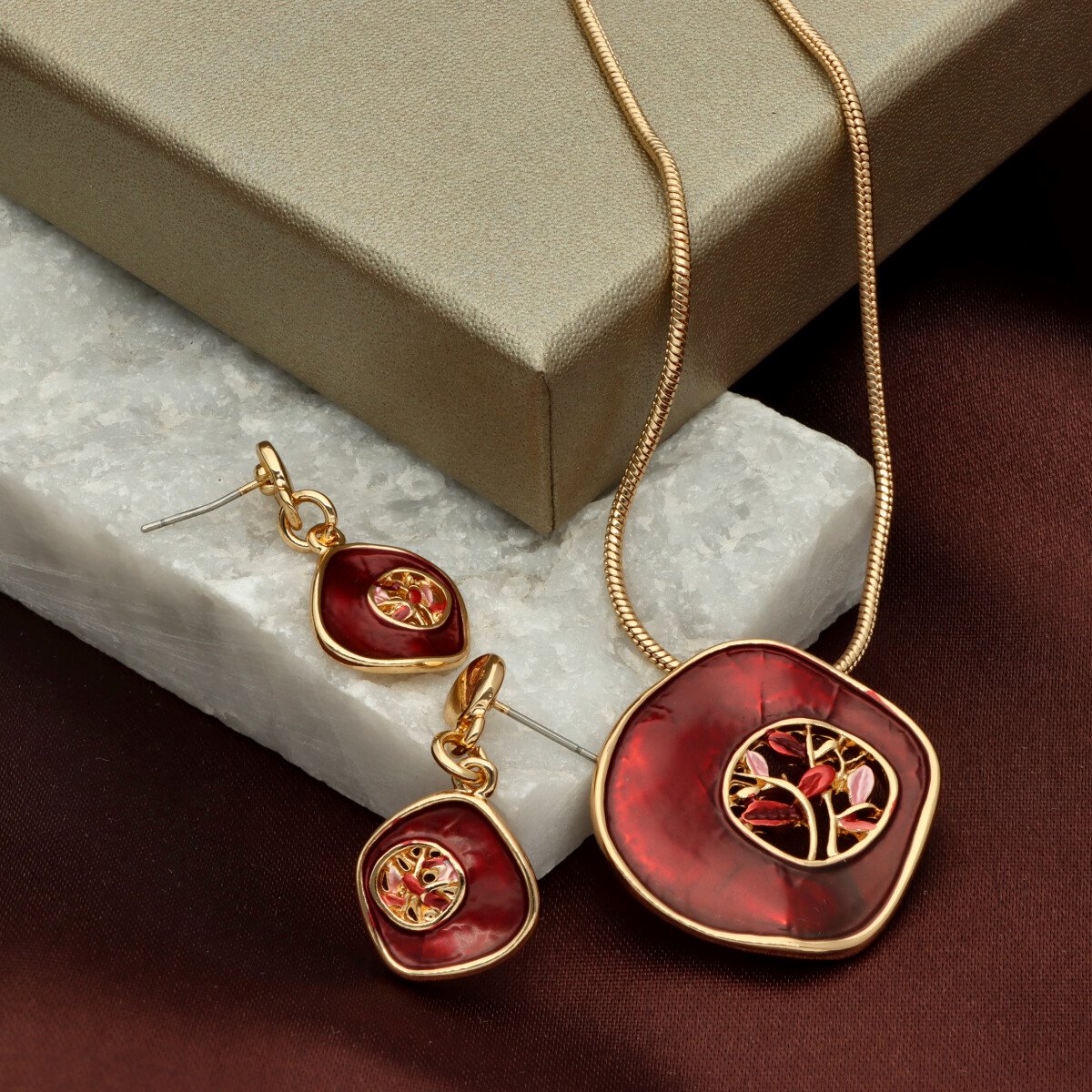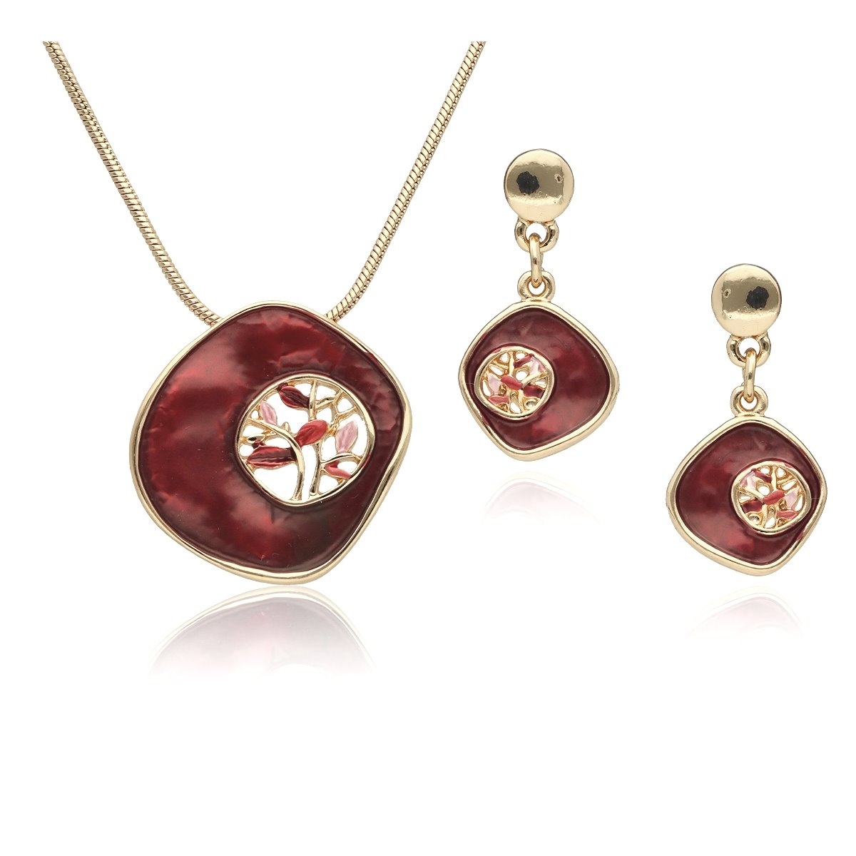 Komplet z kolekcji YVON BIŻUTERIA ARTYSTYCZNA, wykonany z metalu hipoalergicznego. Zdobiony emaliowanymi elementami, które tworzą elegancką, harmonijną kompozycję. Naszyjnik o długości 42 cm z możliwością regulacji o dodatkowe 8 cm, idealnie układa się na dekolcie. Kolczyki na wygodnym zapięciu typu sztyft. Całość zapakowana w eleganckie pudełko prezentowe YVON. To wyjątkowy komplet, który podkreśla kobiecą klasę i artystyczne wyczucie stylu.