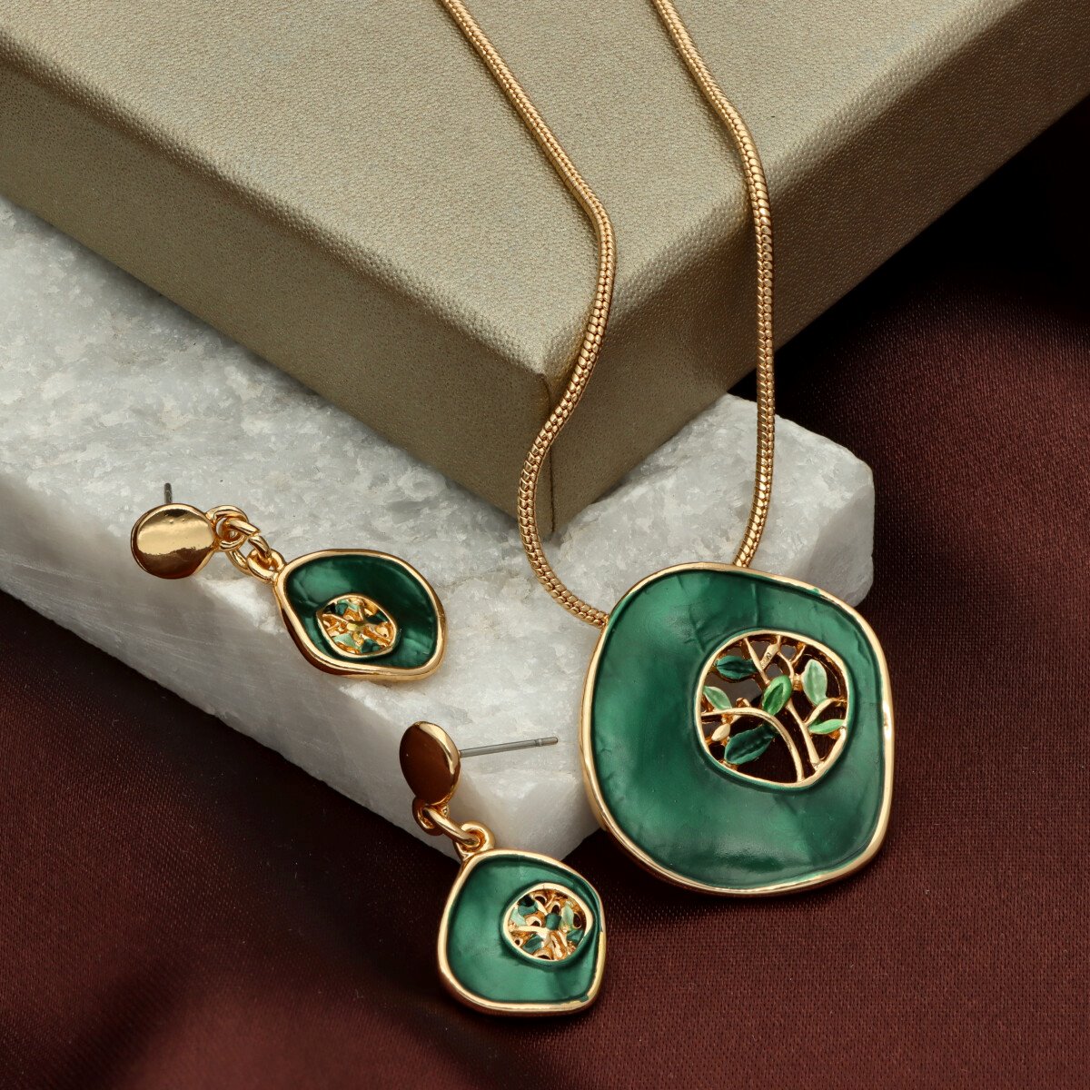 Komplet z kolekcji YVON BIŻUTERIA ARTYSTYCZNA, wykonany z metalu hipoalergicznego. Zdobiony emaliowanymi elementami, które tworzą elegancką, harmonijną kompozycję. Naszyjnik o długości 42 cm z możliwością regulacji o dodatkowe 8 cm, idealnie układa się na dekolcie. Kolczyki na wygodnym zapięciu typu sztyft. Całość zapakowana w eleganckie pudełko prezentowe YVON. To wyjątkowy komplet, który podkreśla kobiecą klasę i artystyczne wyczucie stylu.