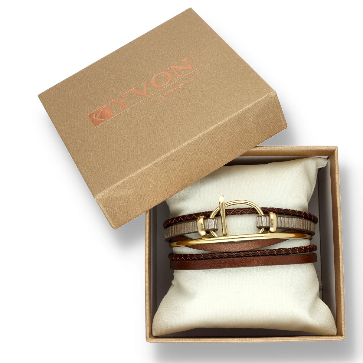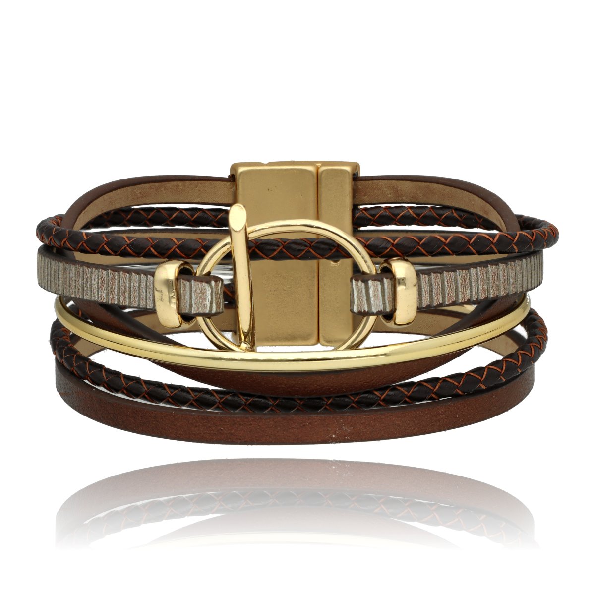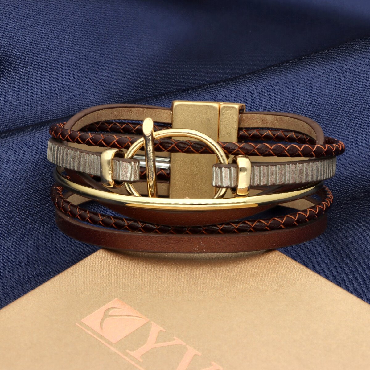 Elegancka bransoletka wykonana z wysokiej jakości skóry naturalnej i eko, zaprojektowana z myślą o nowoczesnych kobietach ceniących styl i wygodę. Wielowarstwowa struktura i metalowe akcenty nadają jej wyrazisty, ale ponadczasowy charakter. Zapięcie na mocny i wygodny magnes zapewnia szybkie zakładanie oraz stabilne trzymanie na nadgarstku. Elementy metalowe wykonane są z metalu hipoalergicznego (zamak i mosiądz), bezpiecznego dla skóry. Bransoletka zapakowana jest w eleganckie pudełeczko (gratis), dzięki czemu doskonale sprawdzi się również jako gotowy pomysł na prezent.