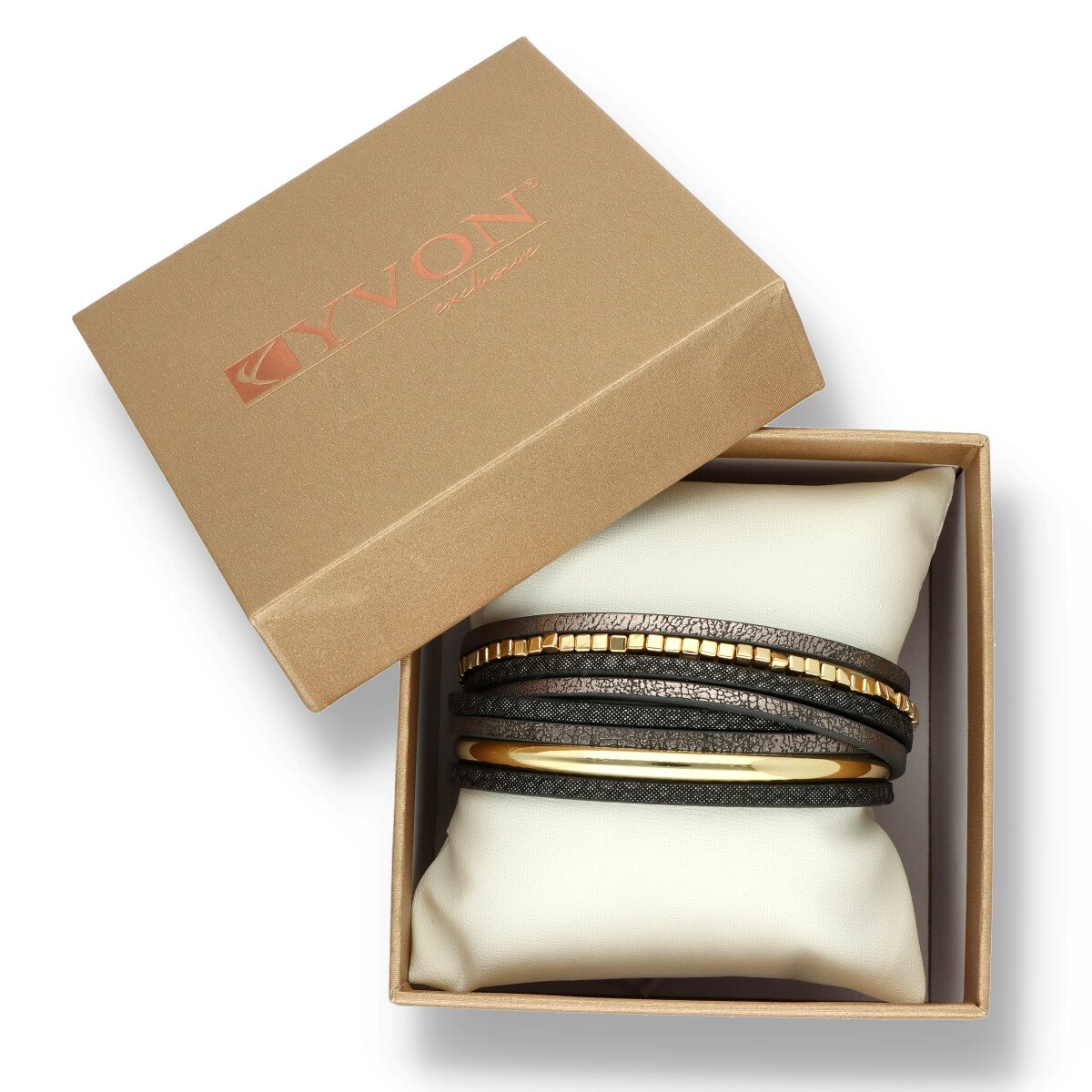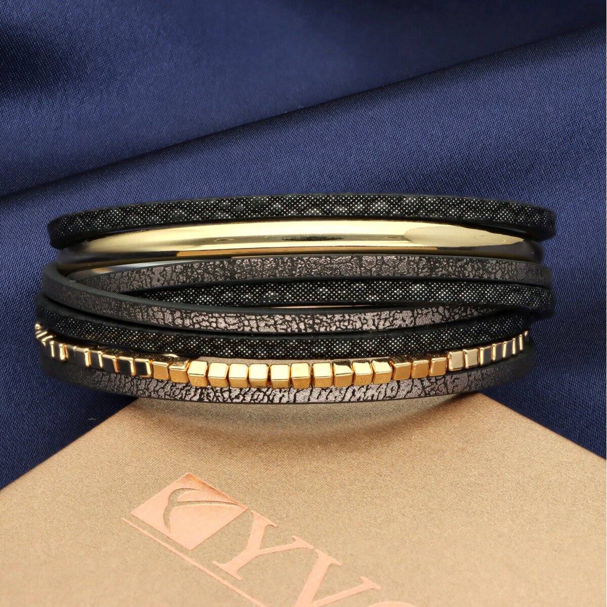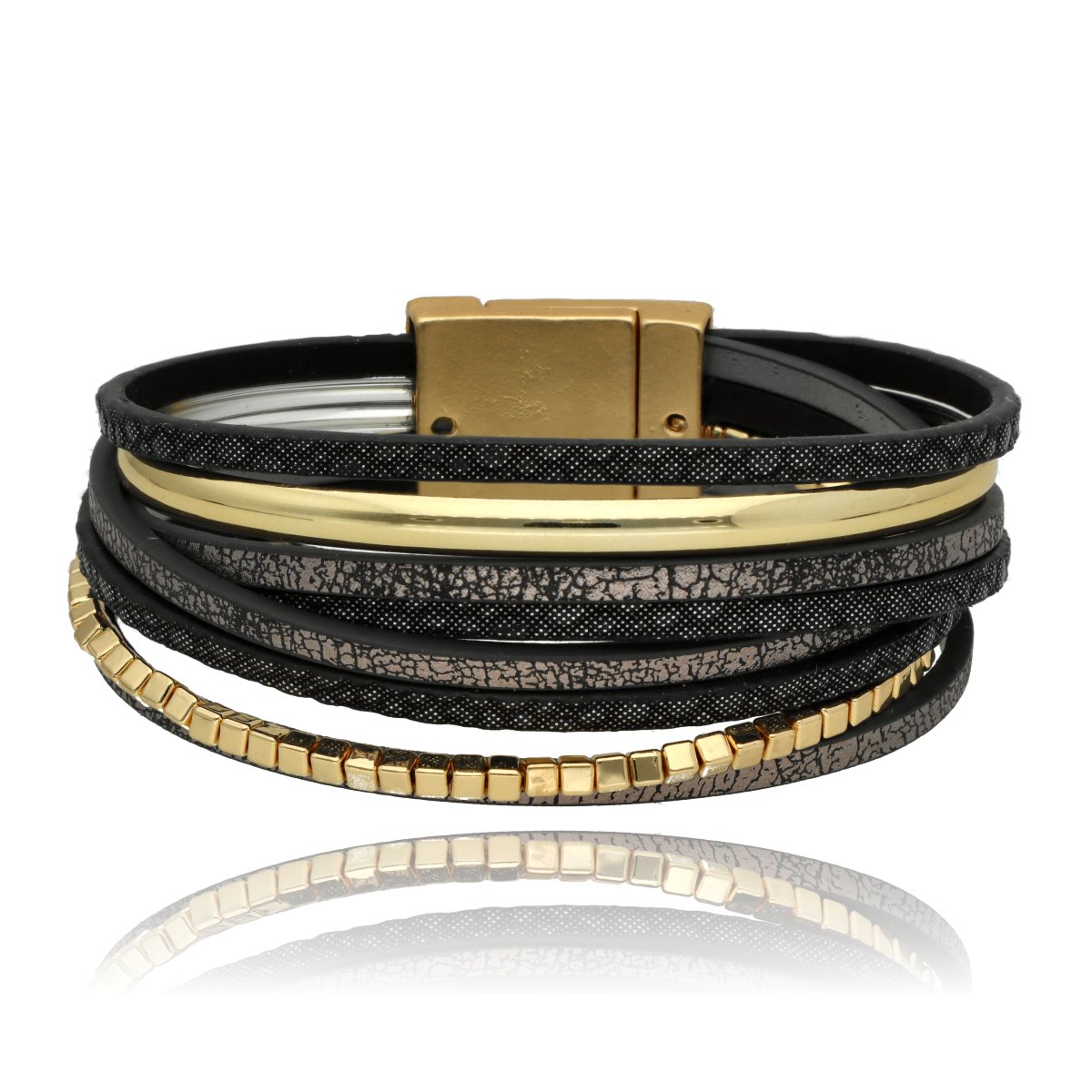 Elegancka bransoletka wykonana z wysokiej jakości skóry eko, zaprojektowana z myślą o nowoczesnych kobietach ceniących styl i wygodę. Wielowarstwowa struktura i metalowe akcenty nadają jej wyrazisty, ale ponadczasowy charakter. Zapięcie na mocny i wygodny magnes zapewnia szybkie zakładanie oraz stabilne trzymanie na nadgarstku. Elementy metalowe wykonane są z metalu hipoalergicznego (zamak i mosiądz), bezpiecznego dla skóry. Bransoletka zapakowana jest w eleganckie pudełeczko (gratis), dzięki czemu doskonale sprawdzi się również jako gotowy pomysł na prezent.