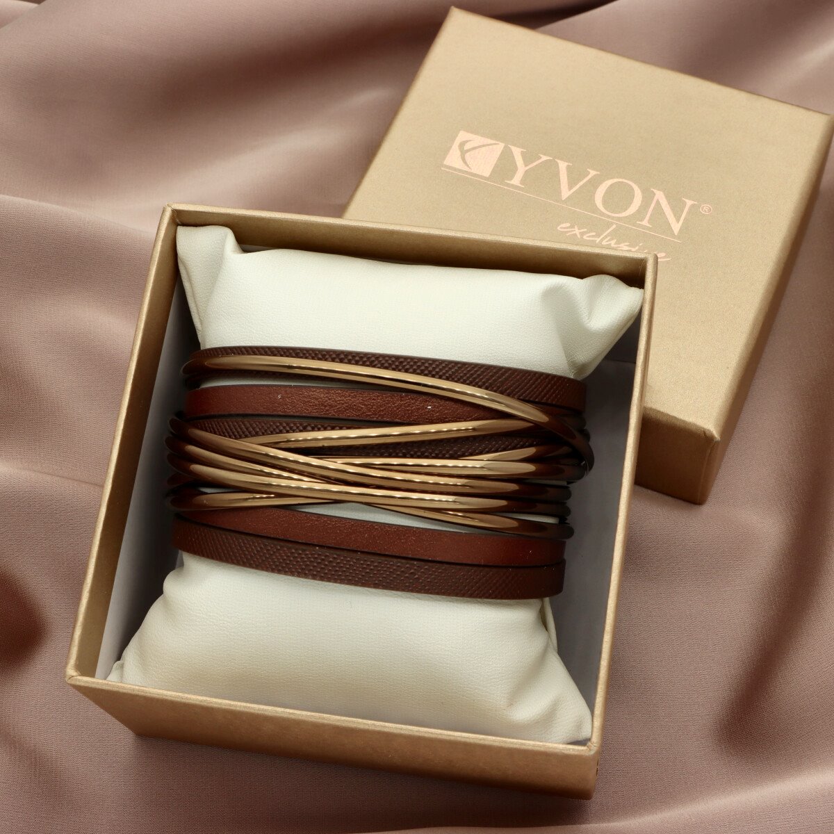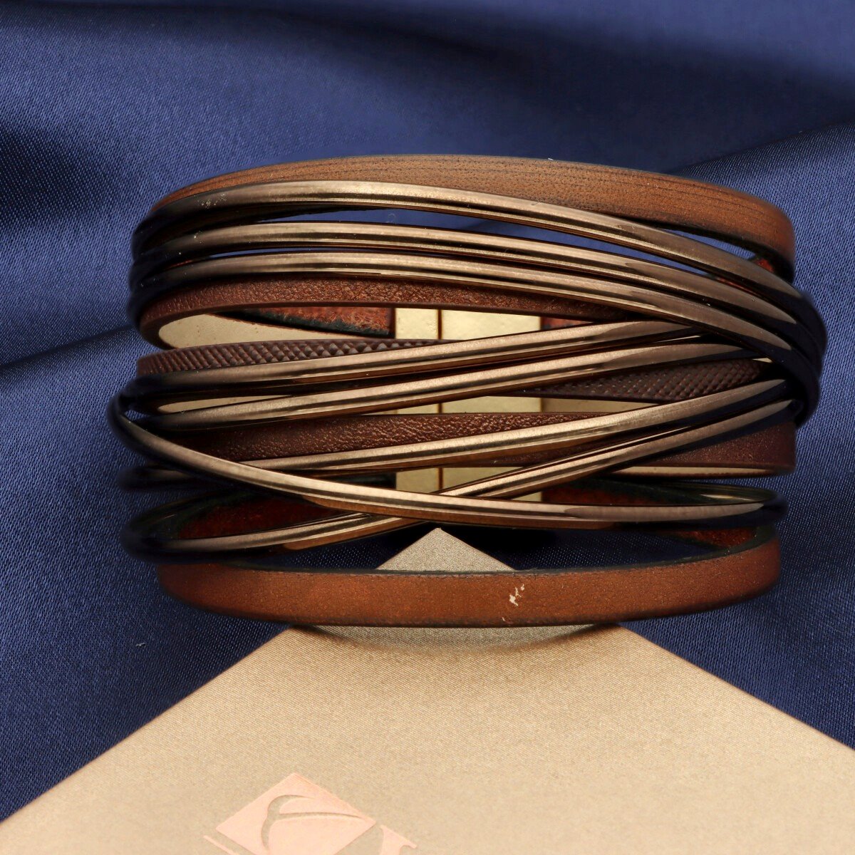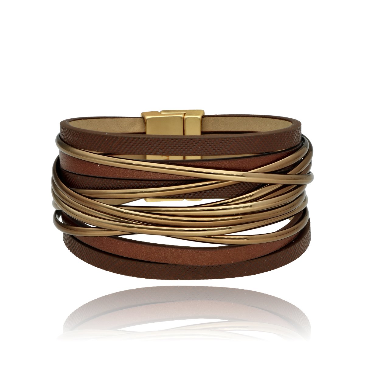 Elegancka bransoletka wykonana z wysokiej jakości skóry naturalnej i eko, zaprojektowana z myślą o nowoczesnych kobietach ceniących styl i wygodę. Wielowarstwowa struktura i metalowe akcenty nadają jej wyrazisty, ale ponadczasowy charakter. Zapięcie na mocny i wygodny magnes zapewnia szybkie zakładanie oraz stabilne trzymanie na nadgarstku. Elementy metalowe wykonane są z metalu hipoalergicznego (zamak i mosiądz), bezpiecznego dla skóry. Bransoletka zapakowana jest w eleganckie pudełeczko (gratis), dzięki czemu doskonale sprawdzi się również jako gotowy pomysł na prezent.