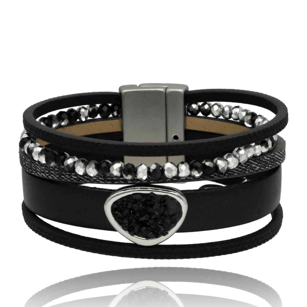 Elegancka bransoletka wykonana z wysokiej jakości skóry naturalnej i eko, zaprojektowana z myślą o nowoczesnych kobietach ceniących styl i wygodę. Wielowarstwowa struktura i metalowe akcenty nadają jej wyrazisty, ale ponadczasowy charakter. Zapięcie na mocny i wygodny magnes zapewnia szybkie zakładanie oraz stabilne trzymanie na nadgarstku. Elementy metalowe wykonane są z metalu hipoalergicznego (zamak i mosiądz), bezpiecznego dla skóry. Bransoletka zapakowana jest w eleganckie pudełeczko (gratis), dzięki czemu doskonale sprawdzi się również jako gotowy pomysł na prezent.