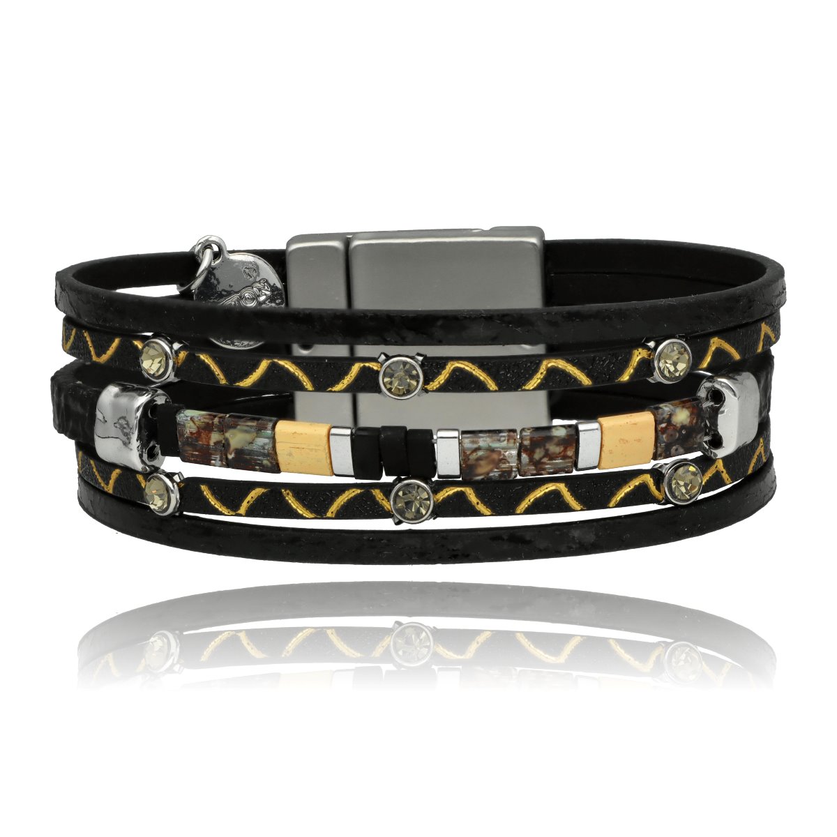 Zapięcie na mocny i wygodny magnes zapewnia szybkie zakładanie oraz stabilne trzymanie na nadgarstku. Elementy metalowe wykonane są z metalu hipoalergicznego (zamak i mosiądz), bezpiecznego dla skóry.