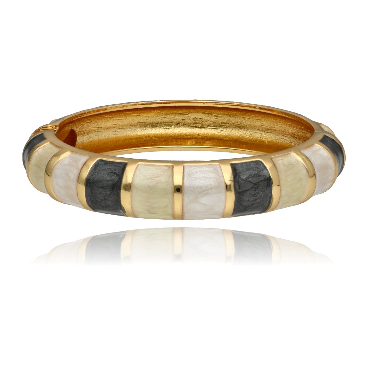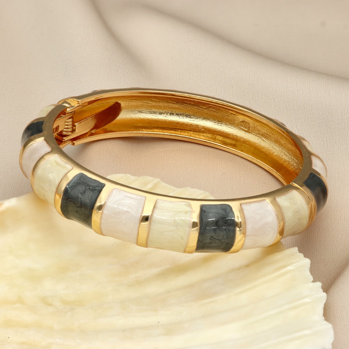 Opis produktu Stylowa bransoletka marki YVON to połączenie nowoczesnego designu z ponadczasową elegancją. Wyróżnia się geometrycznym wzorem z kolorową emalią, która nadaje jej charakteru i sprawia, że każda stylizacja zyskuje modowy akcent. Wykonana z wysokiej jakości metalu hipoalergicznego (zamak), jest bezpieczna dla skóry i komfortowa w codziennym noszeniu. Starannie wykończona powierzchnia oraz zestawienia kolorystyczne tworzą spójną, elegancką całość – od stonowanych po bardziej wyraziste warianty. Bransoletka posiada praktyczne, rozchylane zapięcie, które umożliwia szybkie i wygodne zakładanie oraz dopasowanie do nadgarstka. Dzięki temu model jest uniwersalny i doskonale sprawdzi się zarówno na co dzień, jak i jako uzupełnienie bardziej eleganckich stylizacji. To biżuteria dla kobiet, które lubią subtelny, ale zauważalny detal.