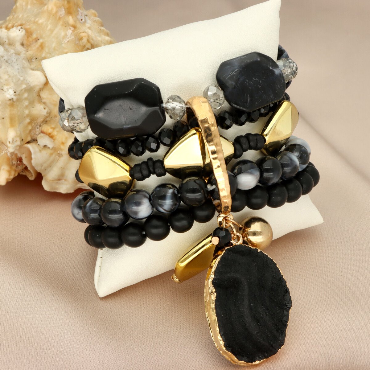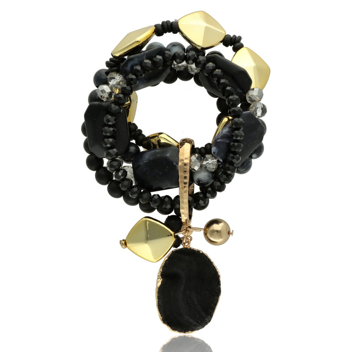 Efektowna, wielorzędowa bransoleta YVON to propozycja dla kobiet, które lubią wyrazistą i niebanalną biżuterię. Ten model zachwyca bogactwem form i struktur – łączy w sobie metal w kolorze złotym, szkło fasetowane, elementy drewniane oraz naturalne kamienie, takie jak AGAT szary i czarny.