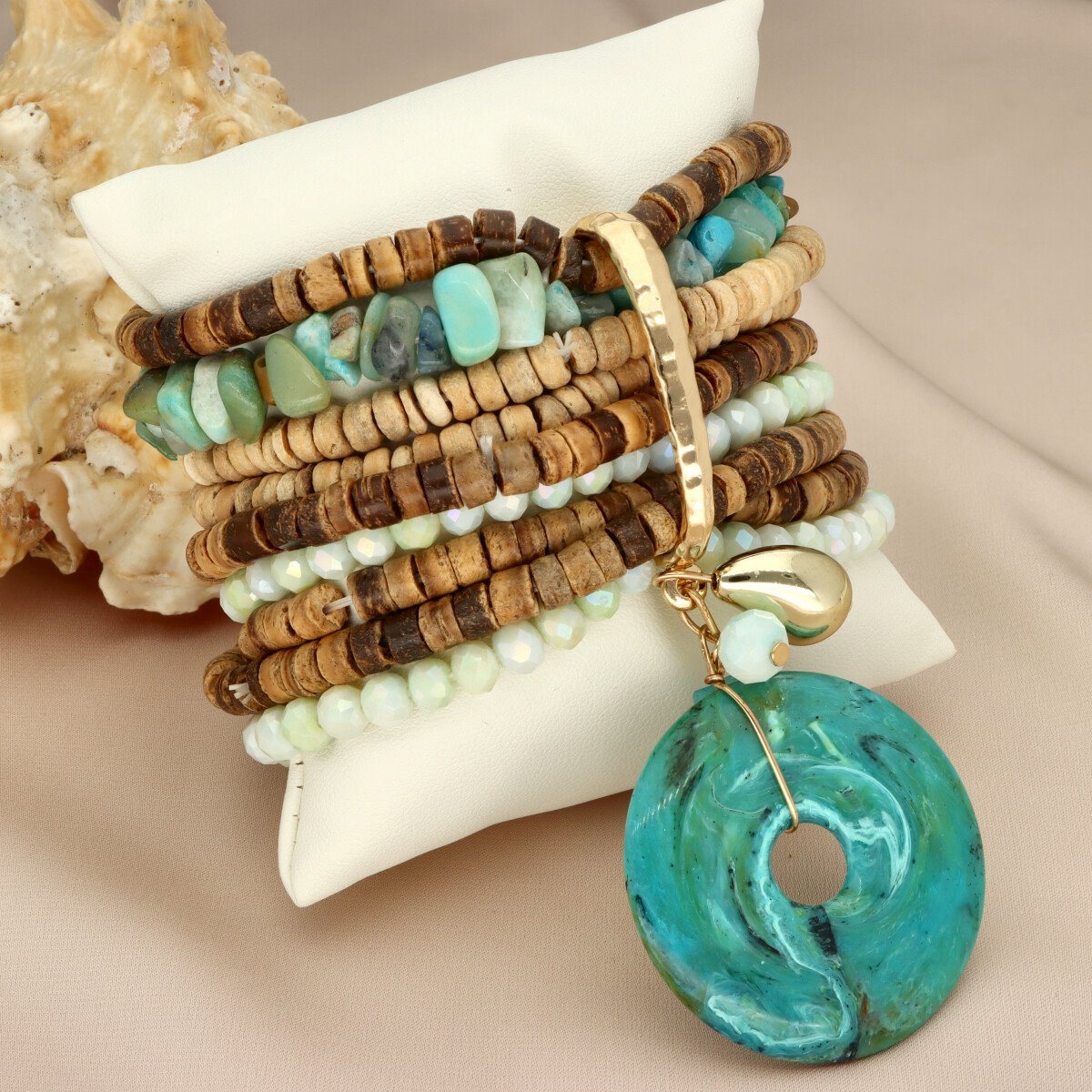 Różnorodność materiałów tworzy spójną, ale bardzo designerską kompozycję – od połyskujących, szklanych detali, przez ciepłe drewno, aż po unikalne, naturalne wybarwienia kamieni. Całość uzupełnia dekoracyjna zawieszka, która przyciąga uwagę i nadaje bransoletce wyjątkowego charakteru.