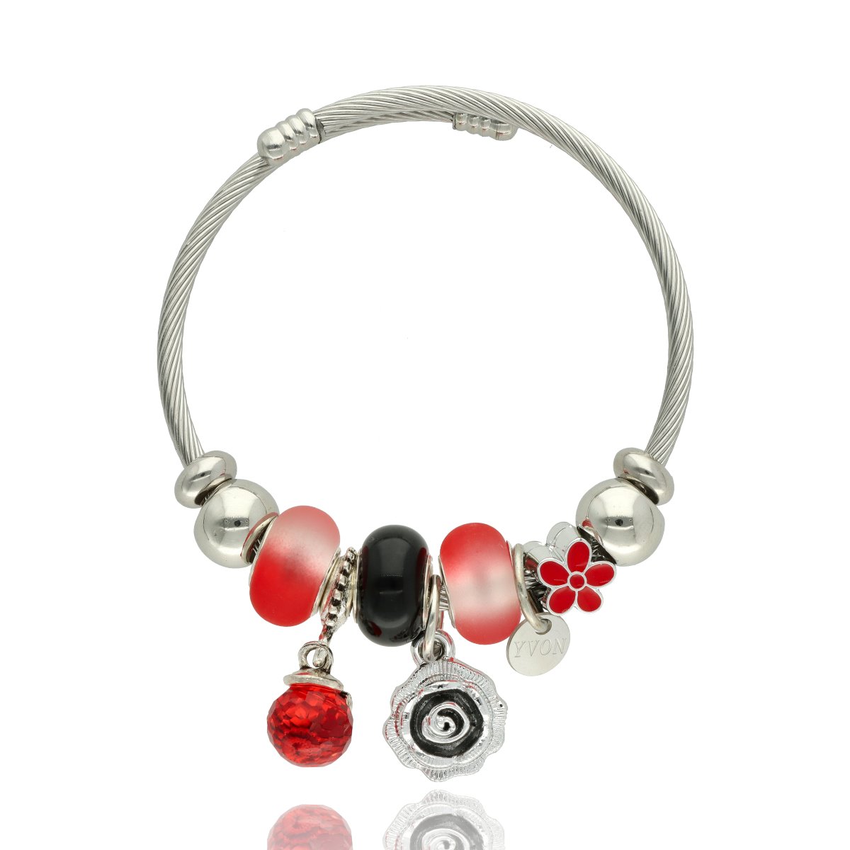 Urocza bransoletka wykonana ze stali szlachetnej (obręcz) oraz zamaku, szkła fasetowanego, ceramiki i emalii (czarmsy). W eleganckim PUDEŁECZKU GRATIS - idealny pomysł na prezent. Biżuteria hypoalergiczna.