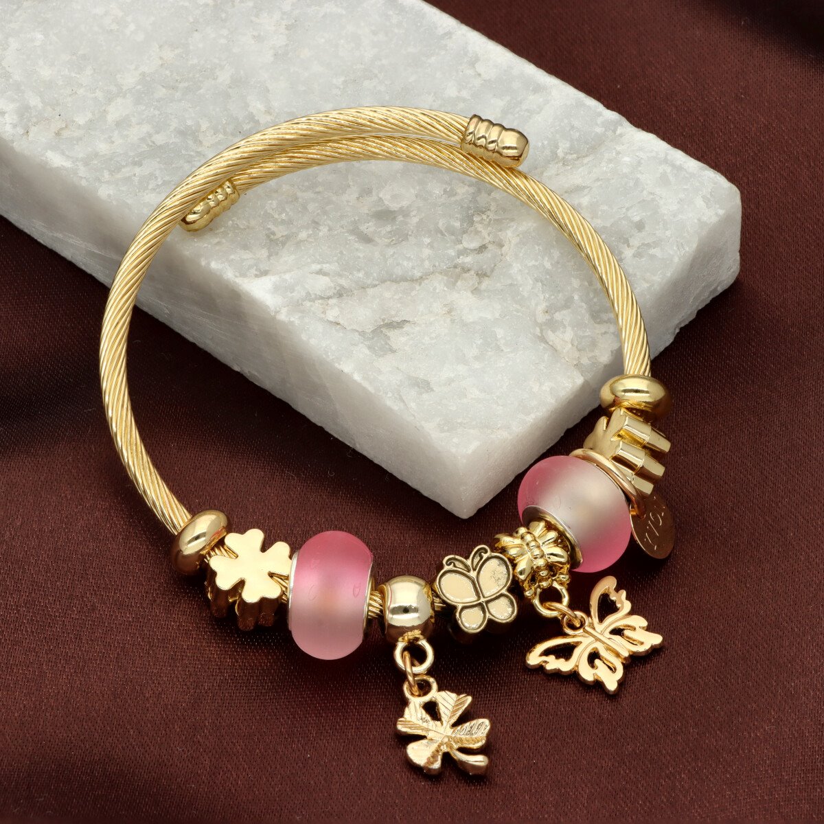 Urocza bransoletka wykonana ze stali szlachetnej (obręcz) oraz zamaku, szkła fasetowanego, ceramiki i emalii (czarmsy). W eleganckim PUDEŁECZKU GRATIS - idealny pomysł na prezent. Biżuteria hypoalergiczna.