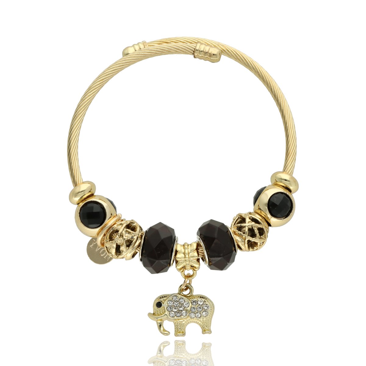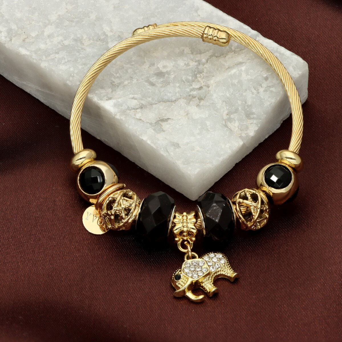 Urocza bransoletka wykonana ze stali szlachetnej (obręcz) oraz zamaku, szkła fasetowanego, ceramiki i emalii (czarmsy). W eleganckim PUDEŁECZKU GRATIS - idealny pomysł na prezent. Biżuteria hypoalergiczna.